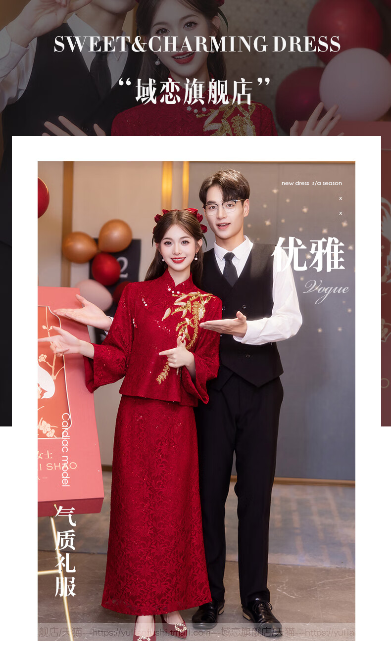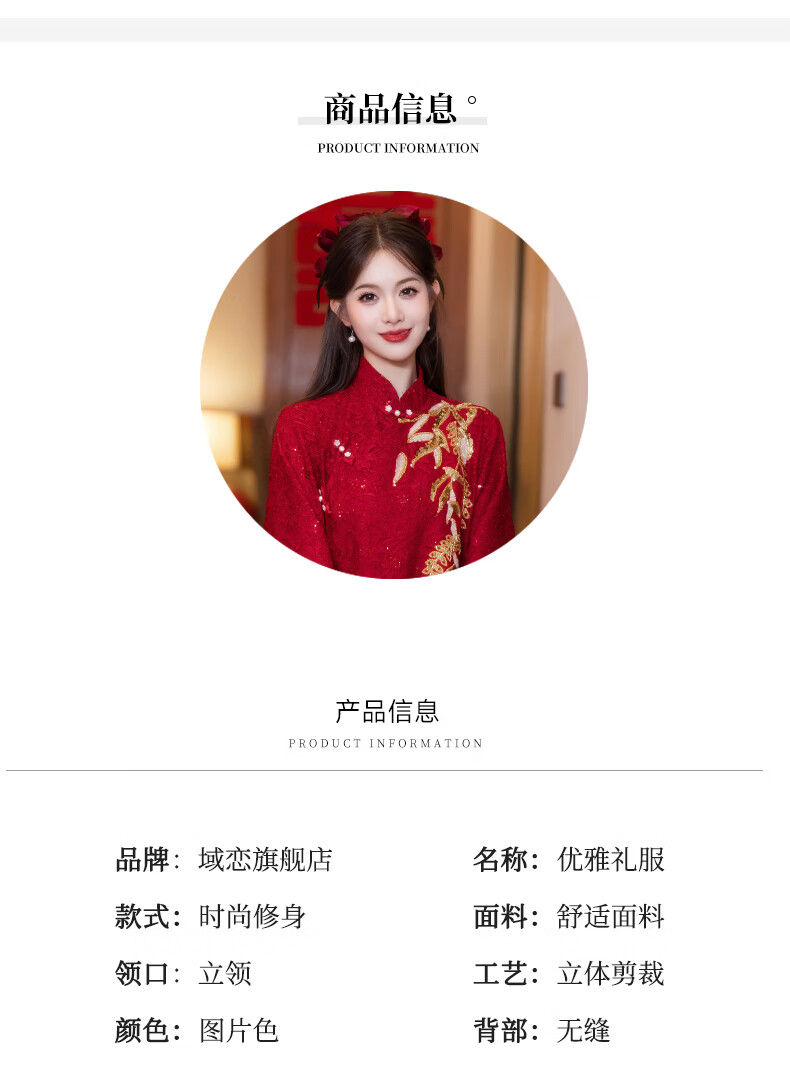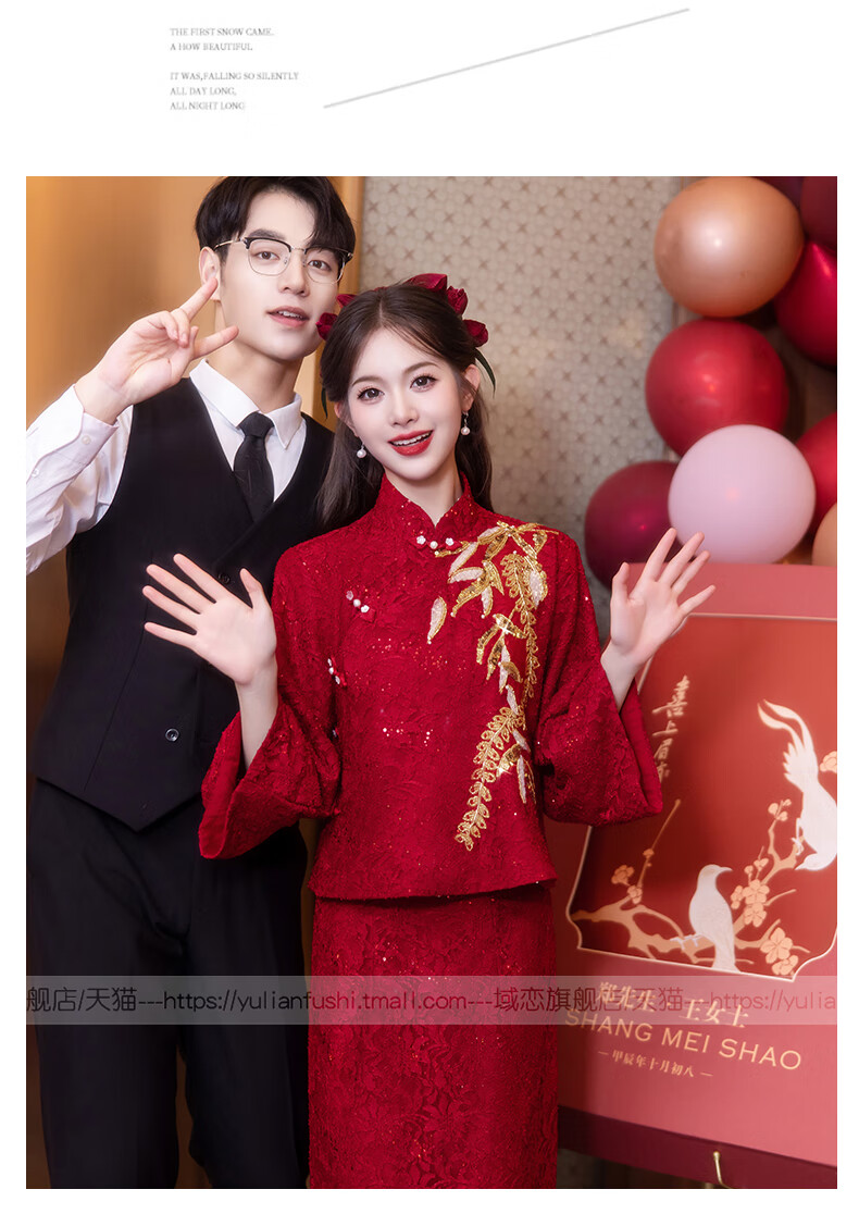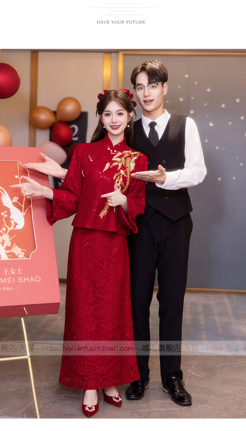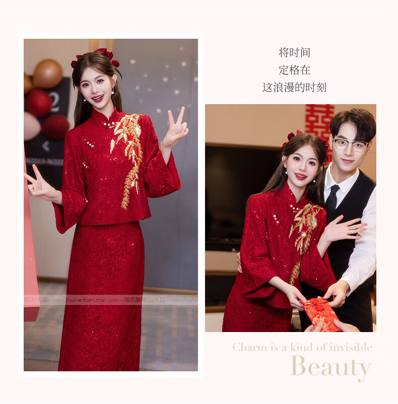 Chuangjingyi Selects New Chinese Style Cheongsam Toast Wear Bride Xiuhe Wear Wine Red Long Sleeve Lace Engagement Dress YL1043 Wine Red 2XL