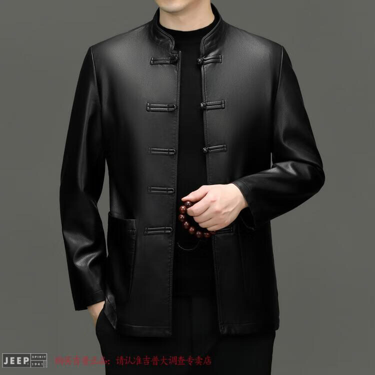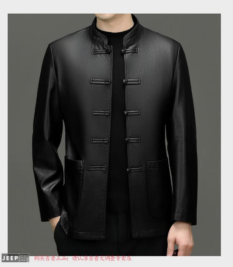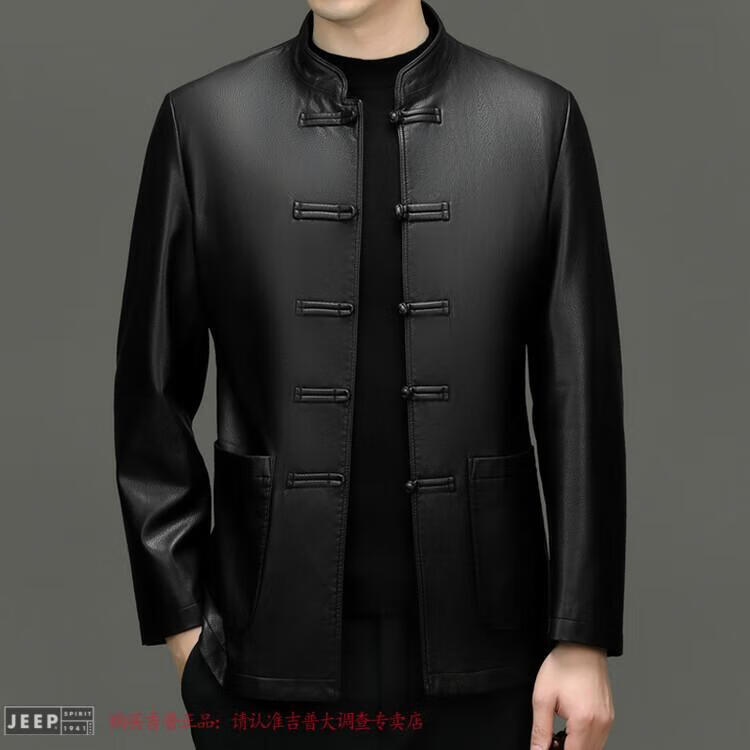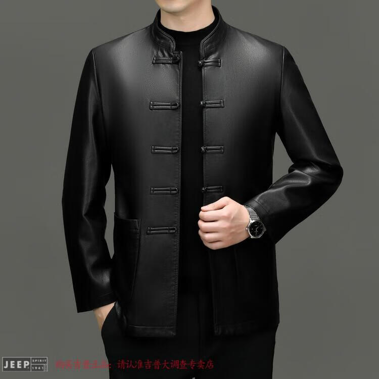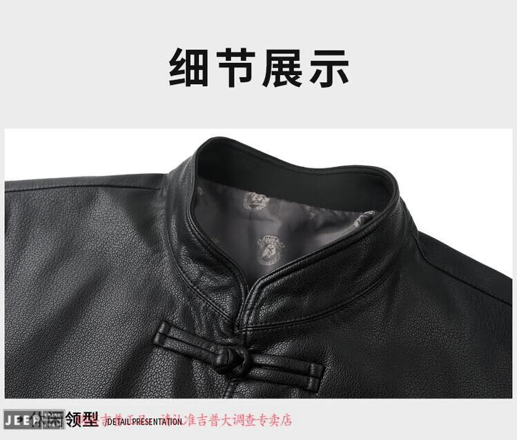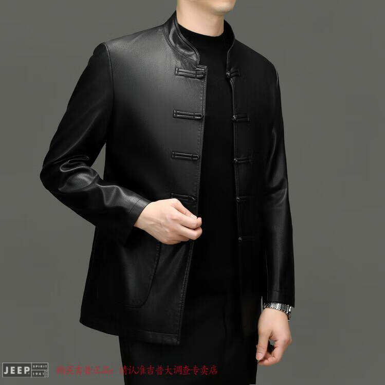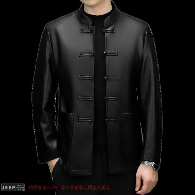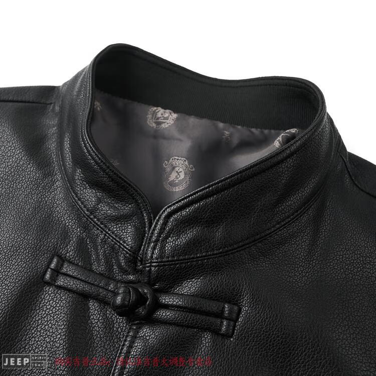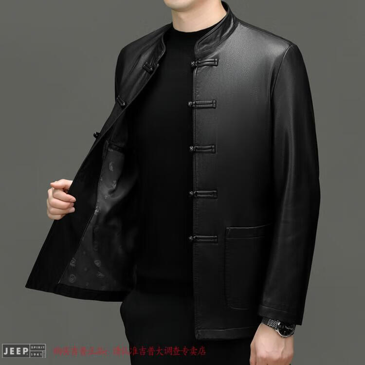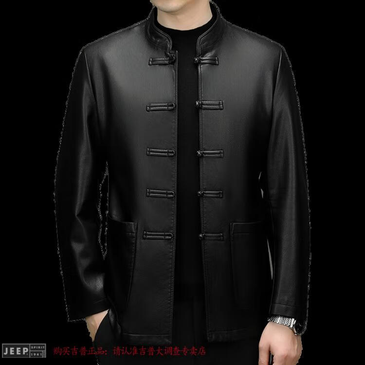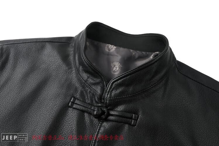 JEEP SPIRIT Spring and Autumn Haining Genuine Leather Jacket Men's First Layer Cowhide Tang Suit Chinese Style Jacket Stand Collar Chinese Style Leather Jacket Thin Black M 170