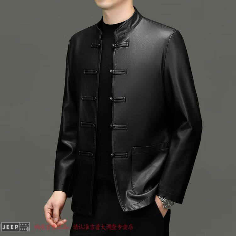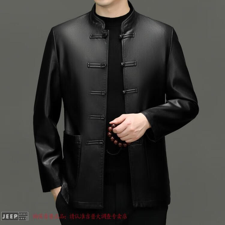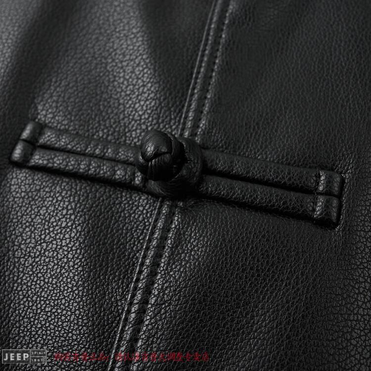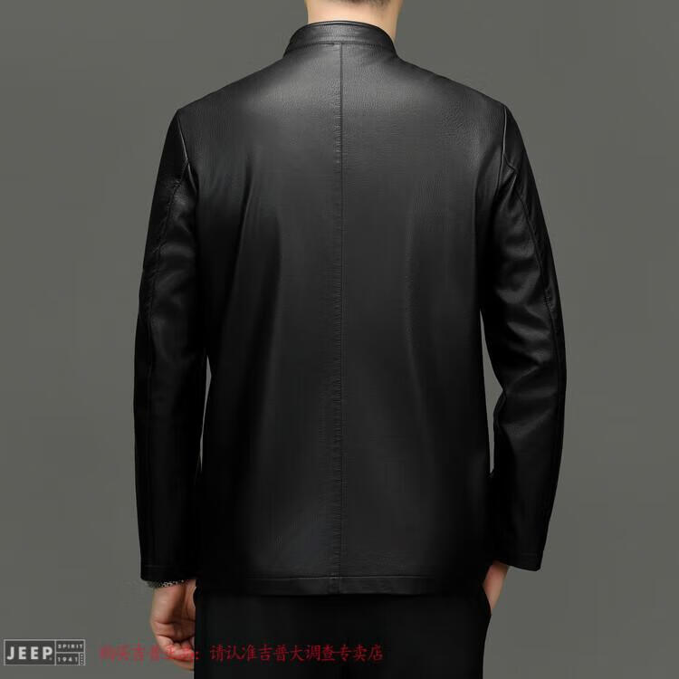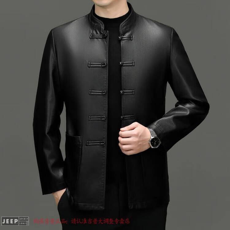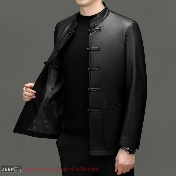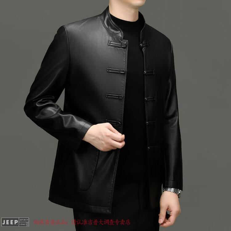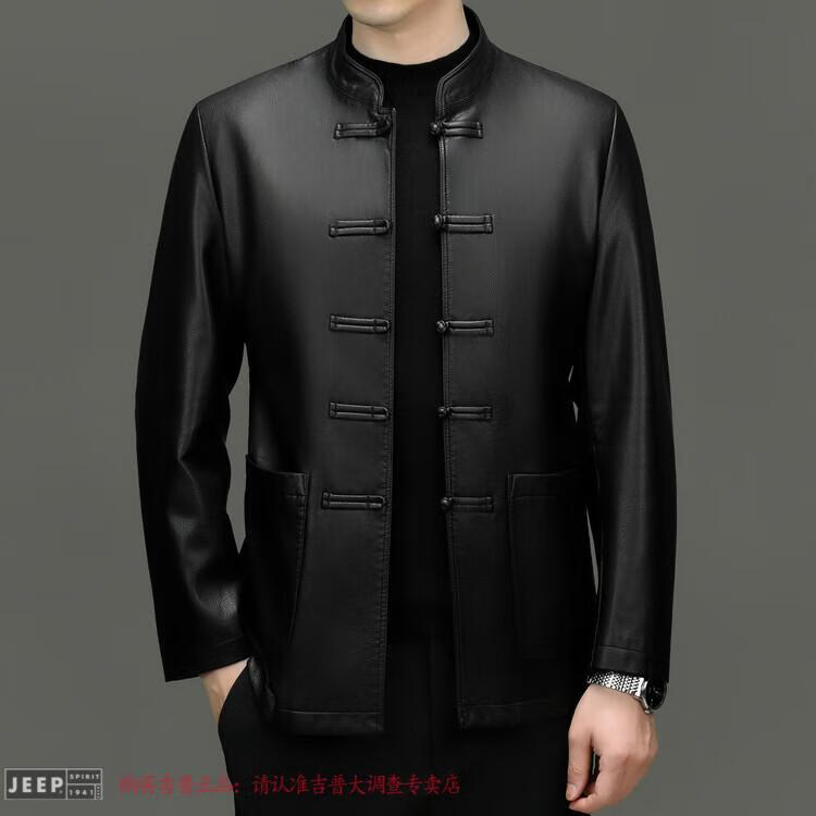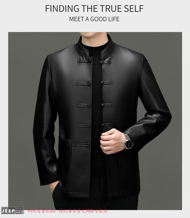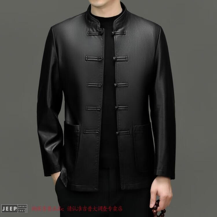 JEEP SPIRIT Spring and Autumn Haining Genuine Leather Jacket Men's First Layer Cowhide Tang Suit Chinese Style Jacket Stand Collar Chinese Style Leather Jacket Thin Black M 170