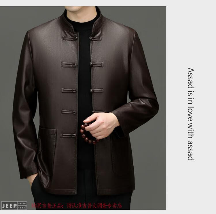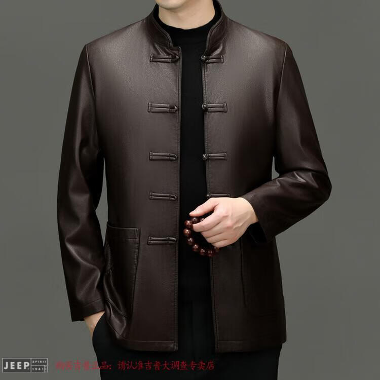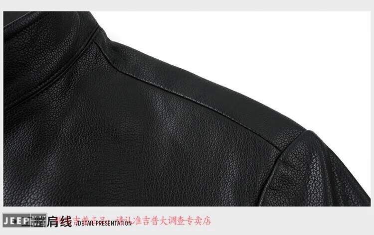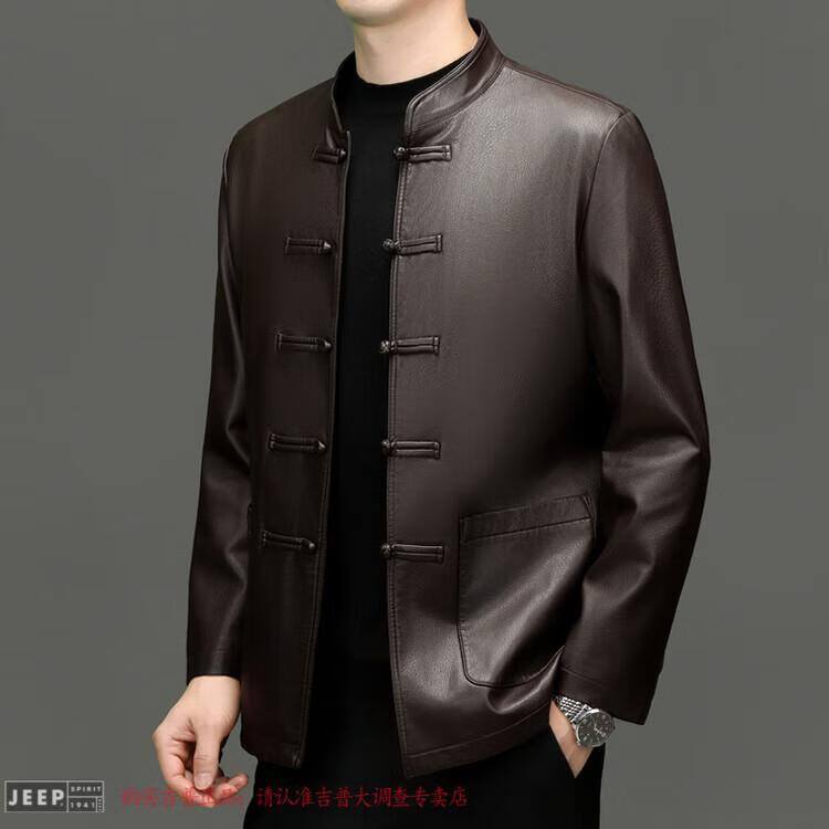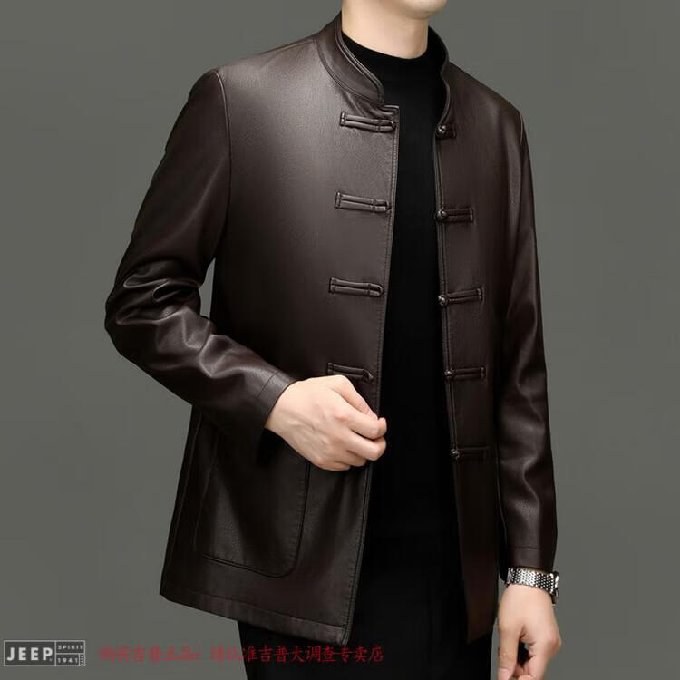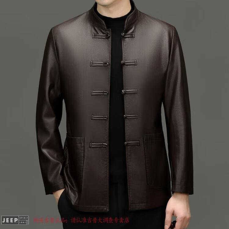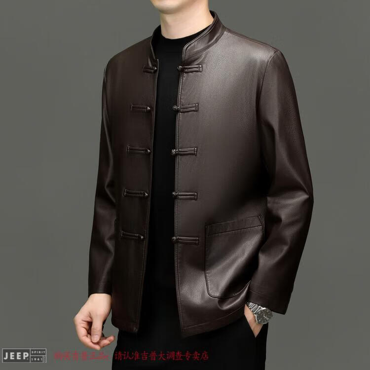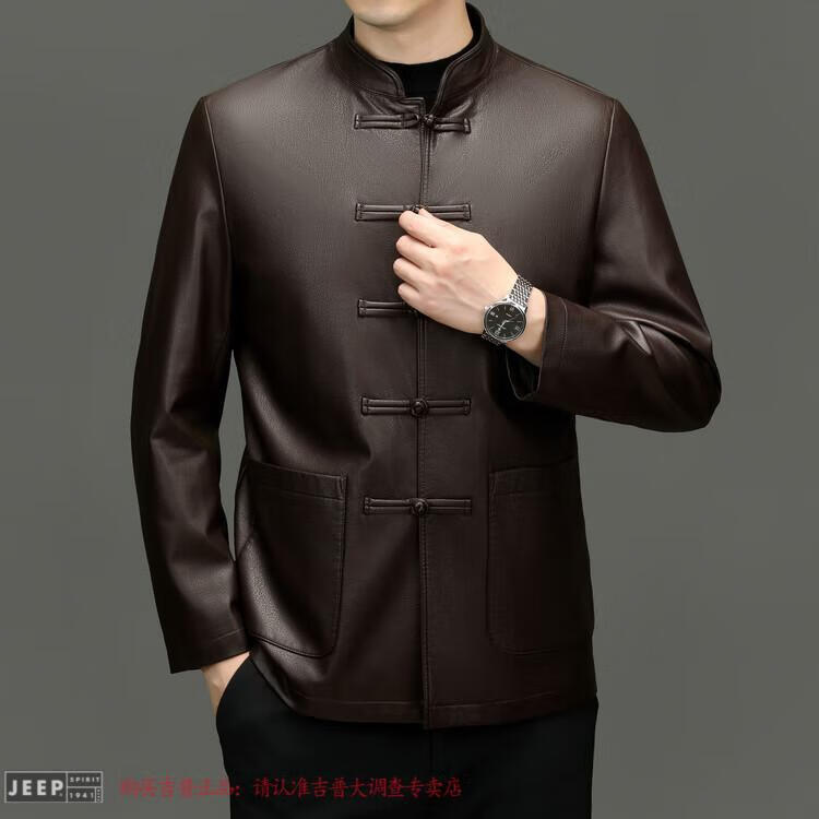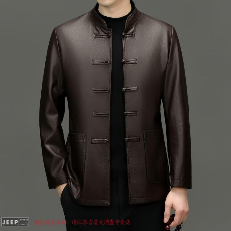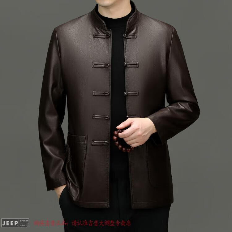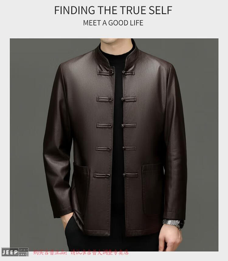 JEEP SPIRIT Spring and Autumn Haining Genuine Leather Jacket Men's First Layer Cowhide Tang Suit Chinese Style Jacket Stand Collar Chinese Style Leather Jacket Thin Black M 170