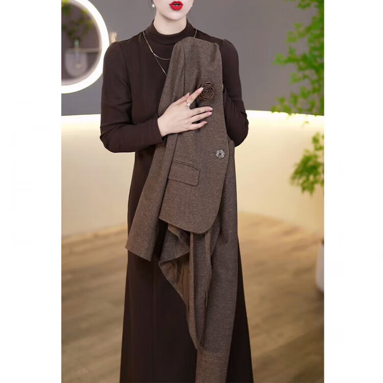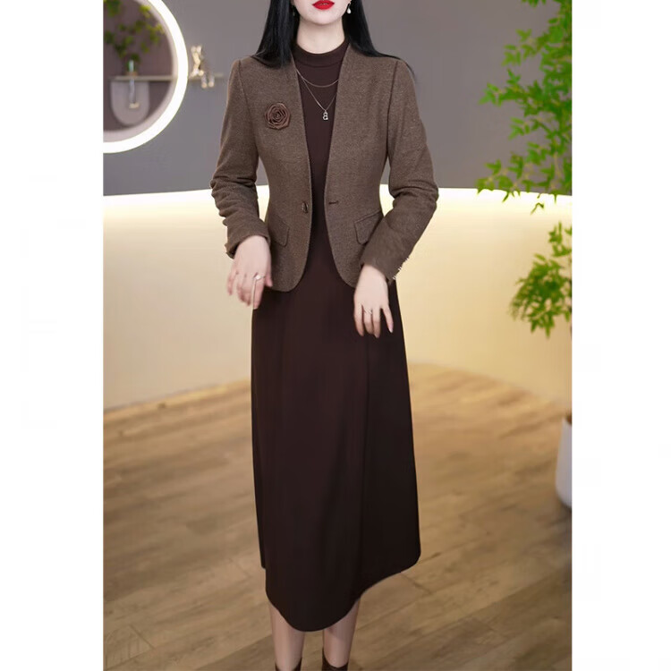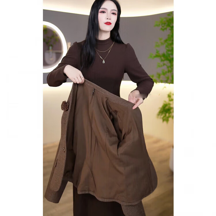Pierre Cardin elegant thickened two-piece dress for women 2025 autumn and winter new lady mother dress suit skirt coffee color two-piece suit L recommended 101-110 Jin Jin equals 0.5 kg