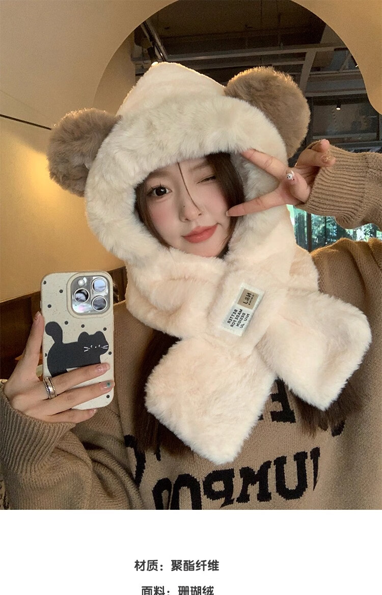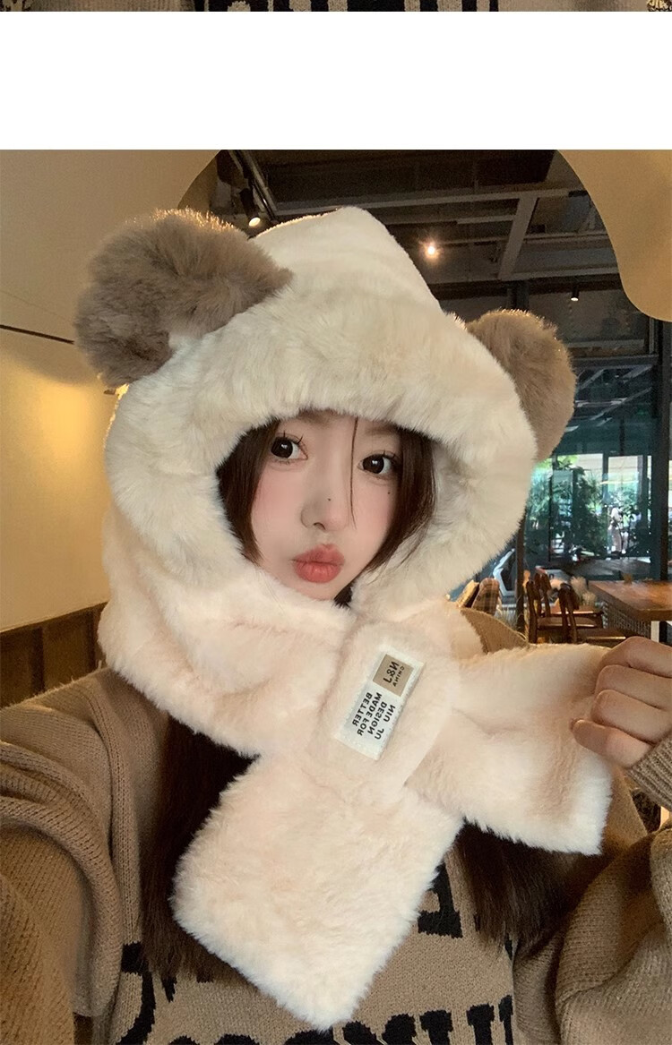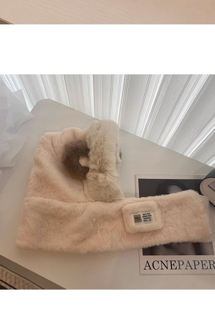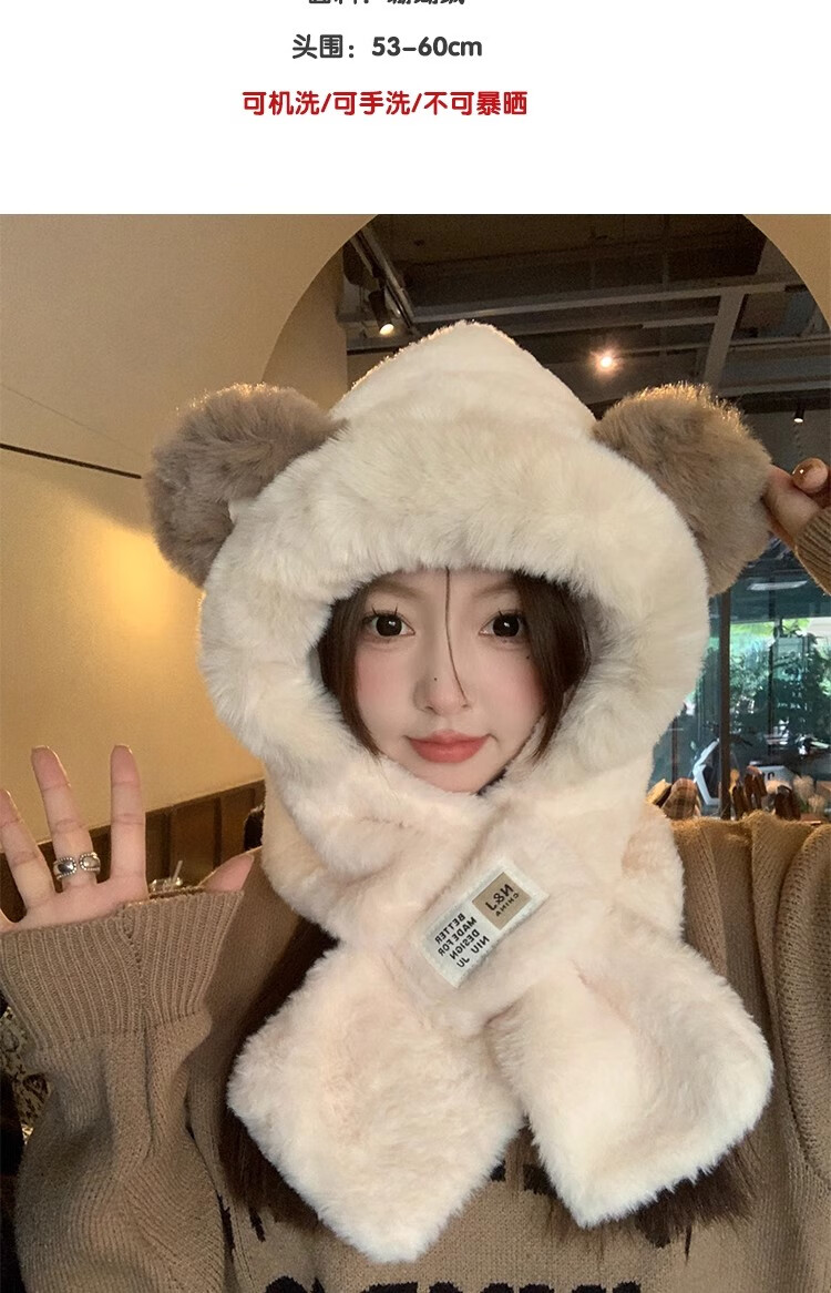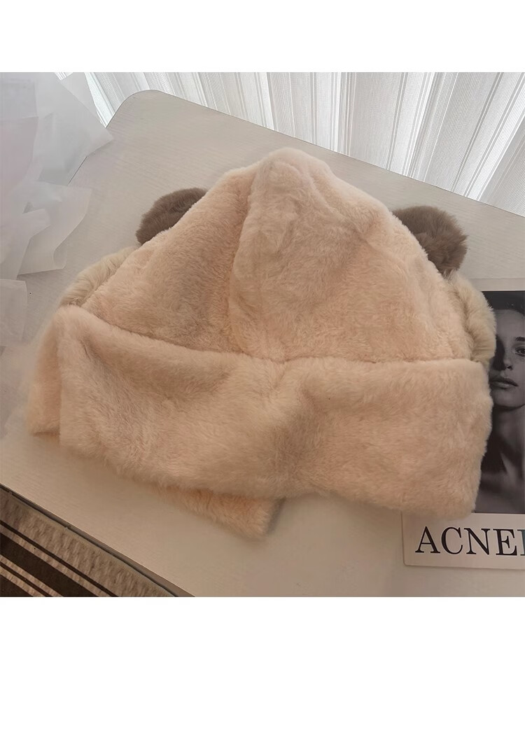 Muchiston furry warm ear protection hat women's scarf one-piece two-piece set winter thickened Lei Feng hat women's autumn and winter scarf beige one size