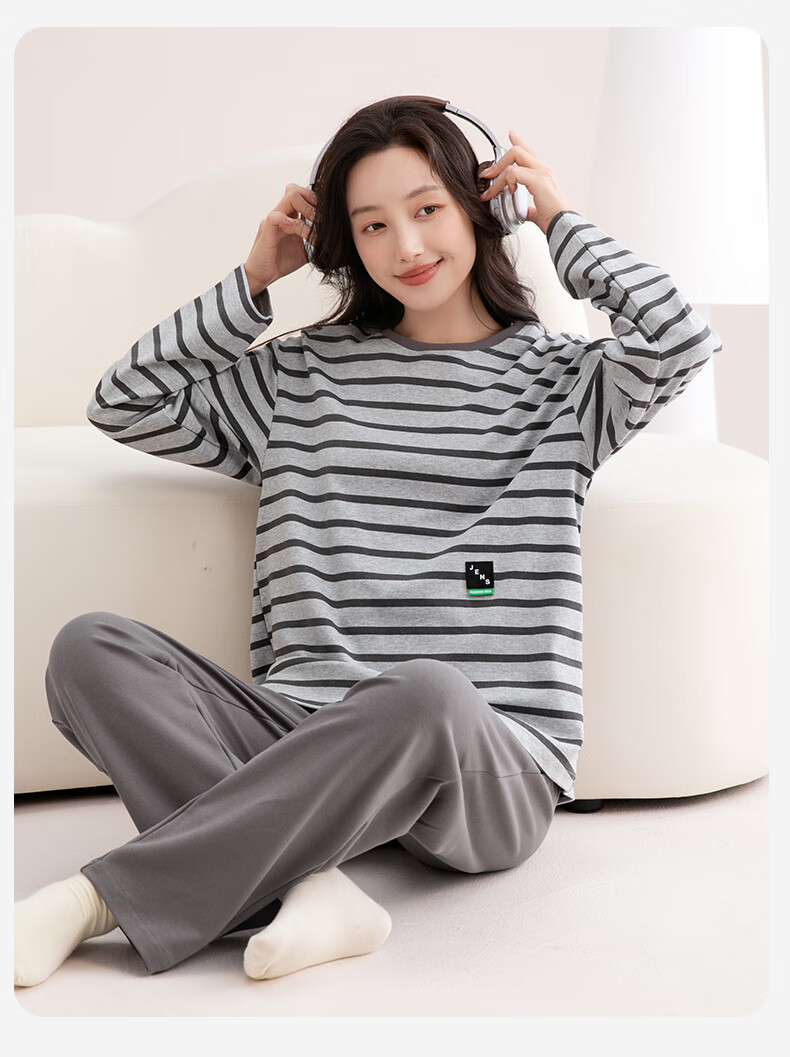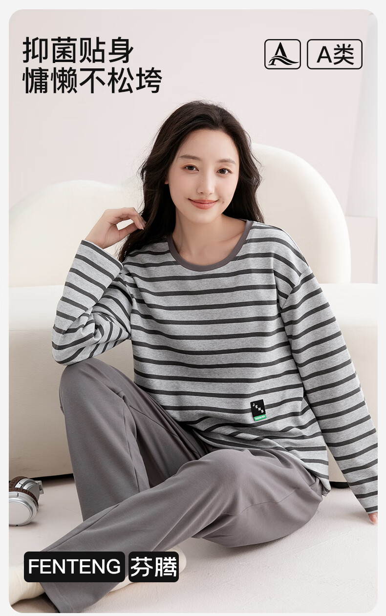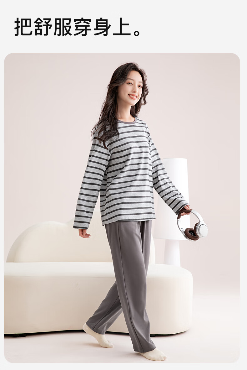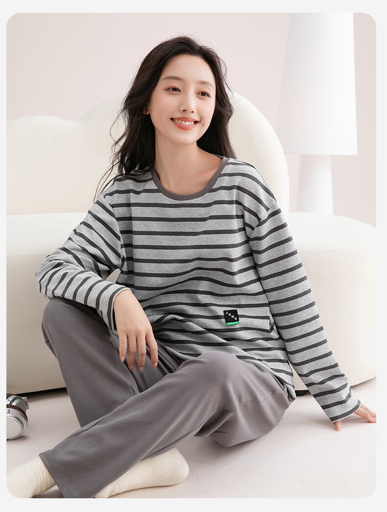 Fenton Pajamas Couple Class A Pure Cotton 2025 Season New Antibacterial Skin Friendly Round Neck Long Sleeve Pajamas Casual Home Wear Set Dark Gray - Men's L