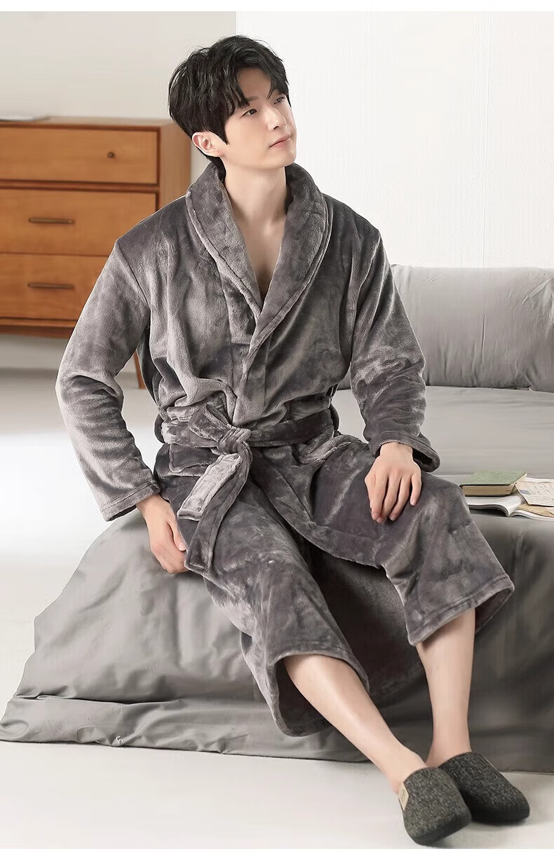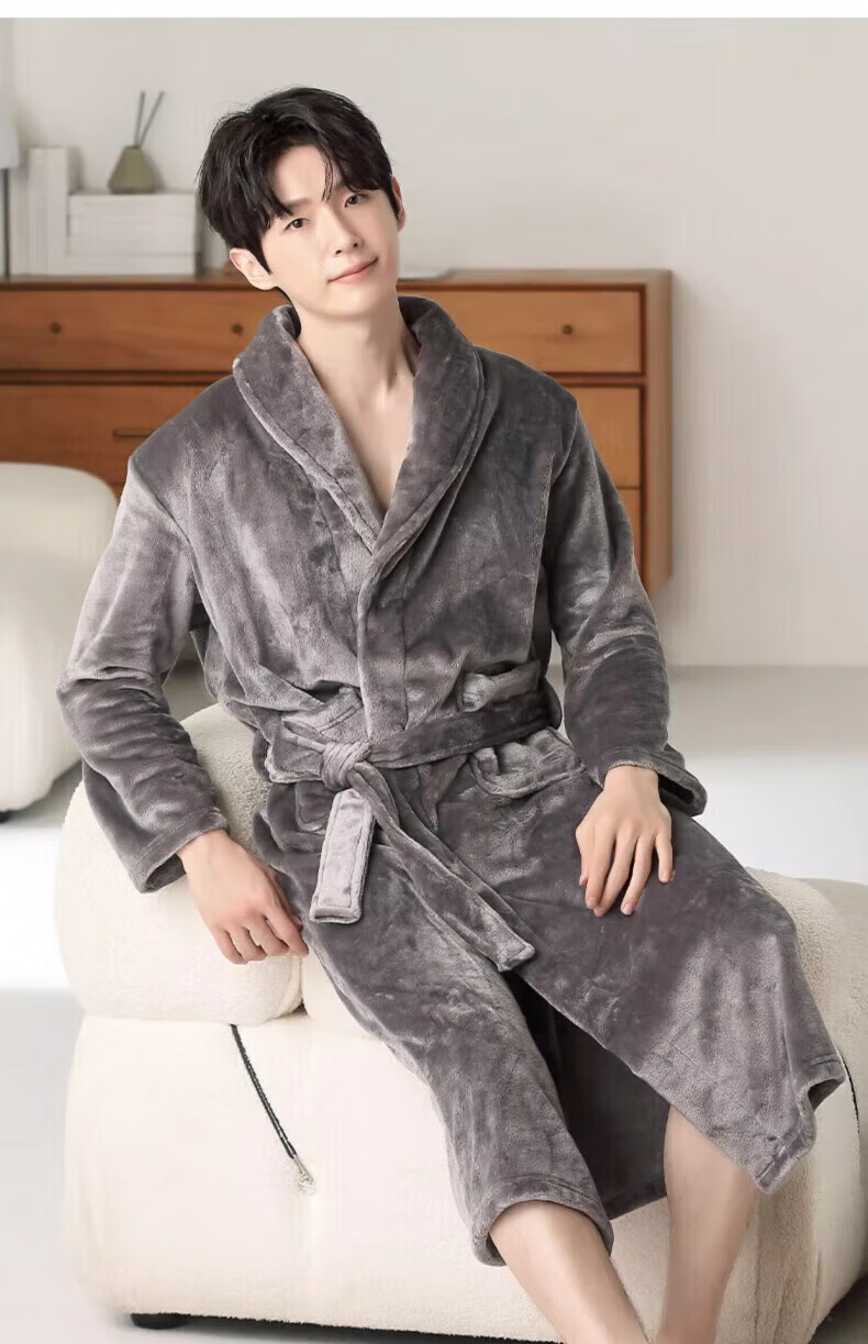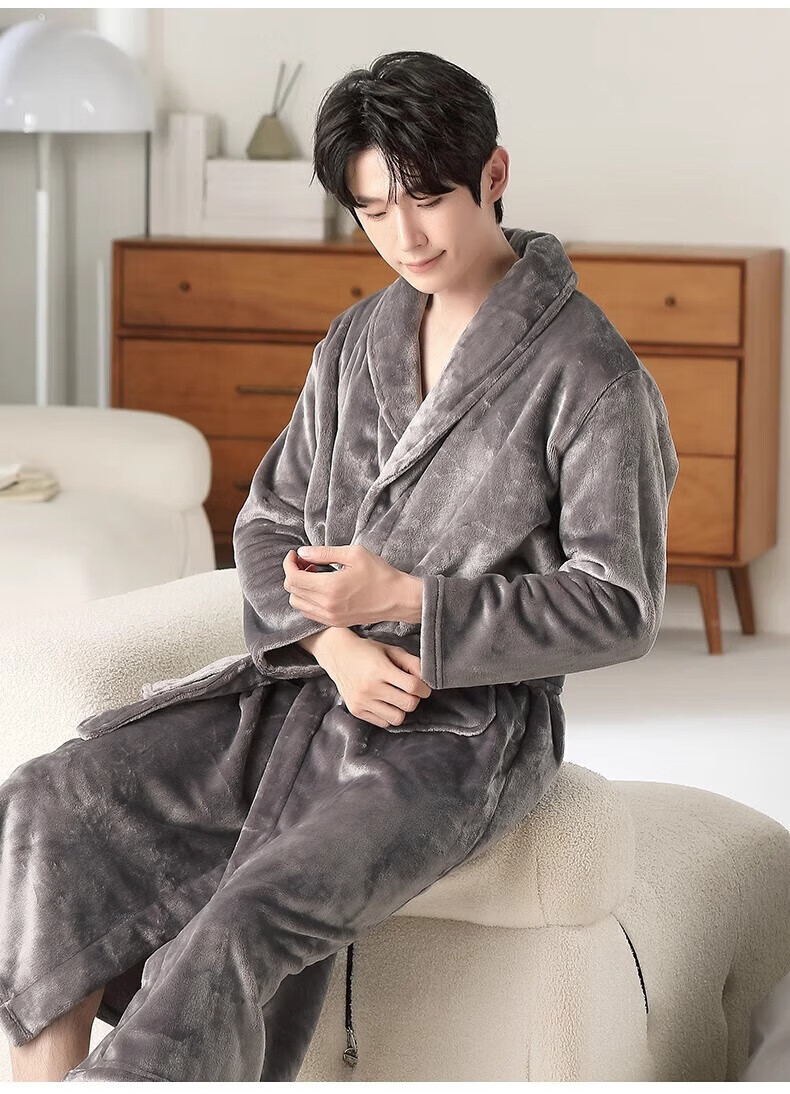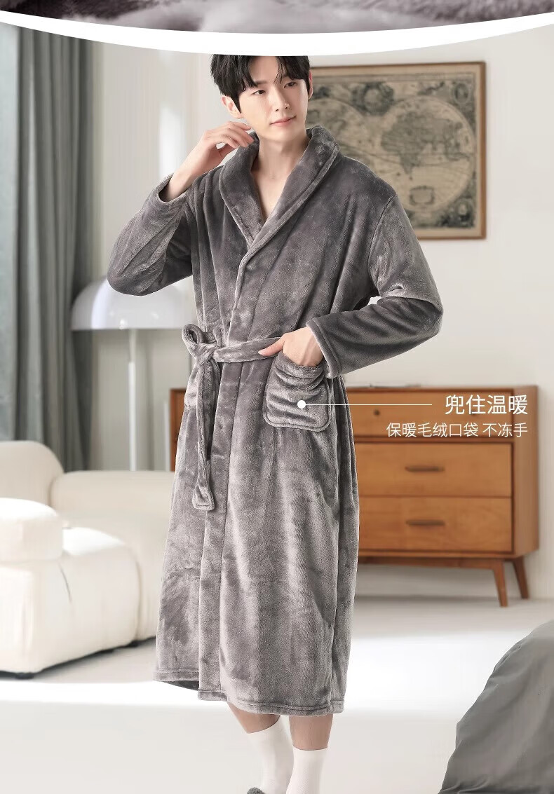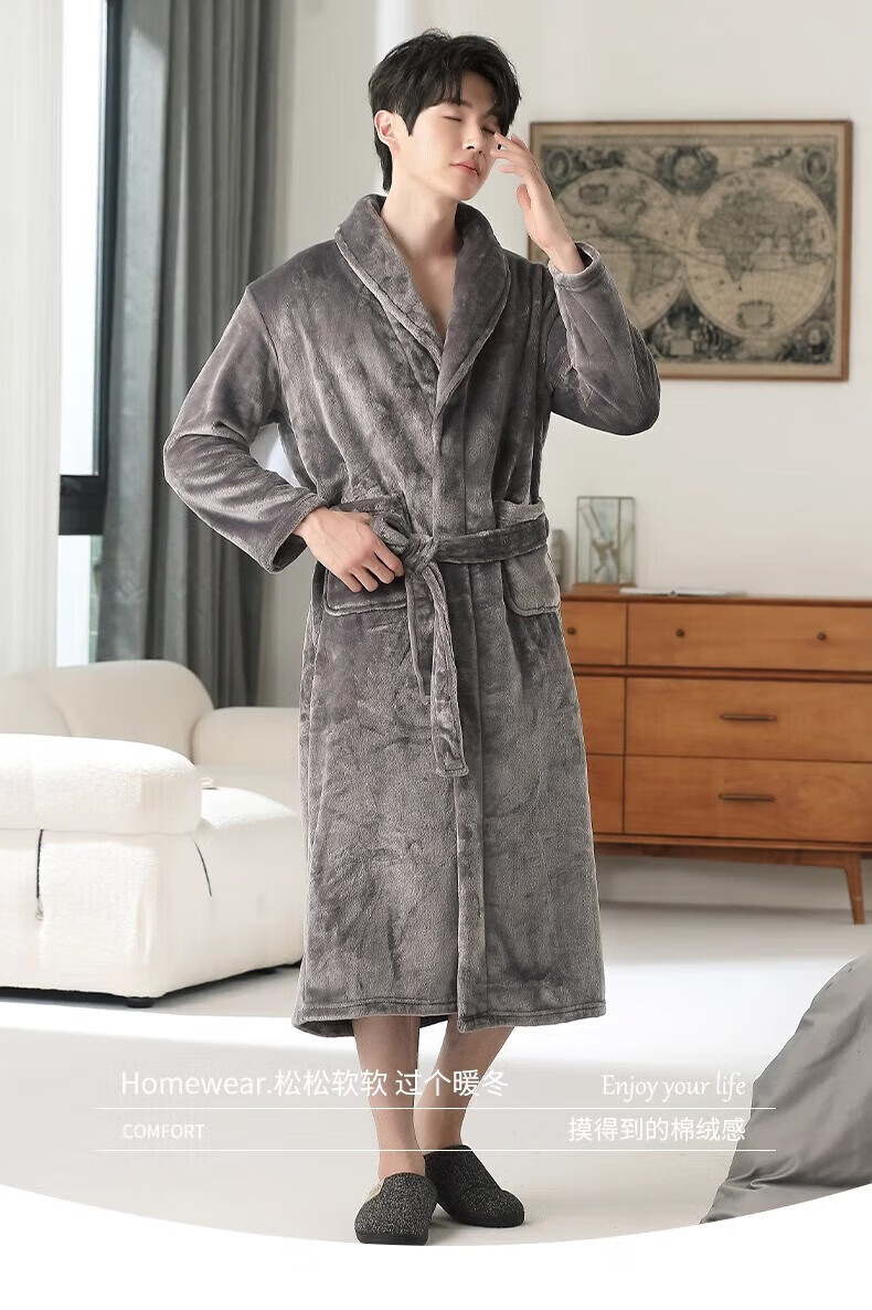 Yalu Nightgown Men's Winter Coral Velvet 25th Autumn and Winter New Thick Plus Velvet Large Size Flannel Bathrobe NSCJF-Y809 Light Gray Men's Robe One Size