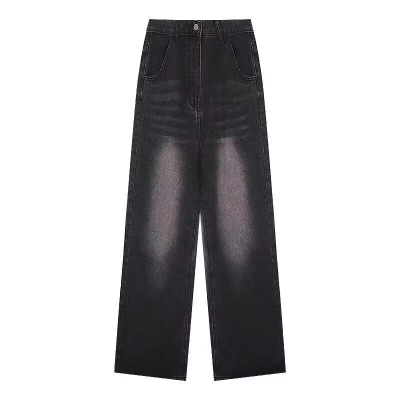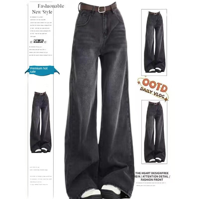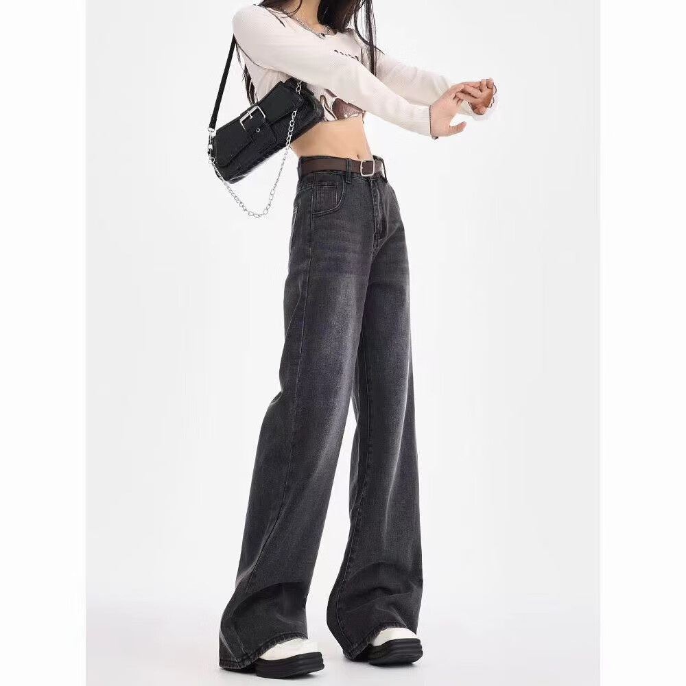 Luyal black and gray wide-leg jeans for women in autumn and winter retro loose and drapey slim slim straight-leg bootcut pants for women, black and gray L