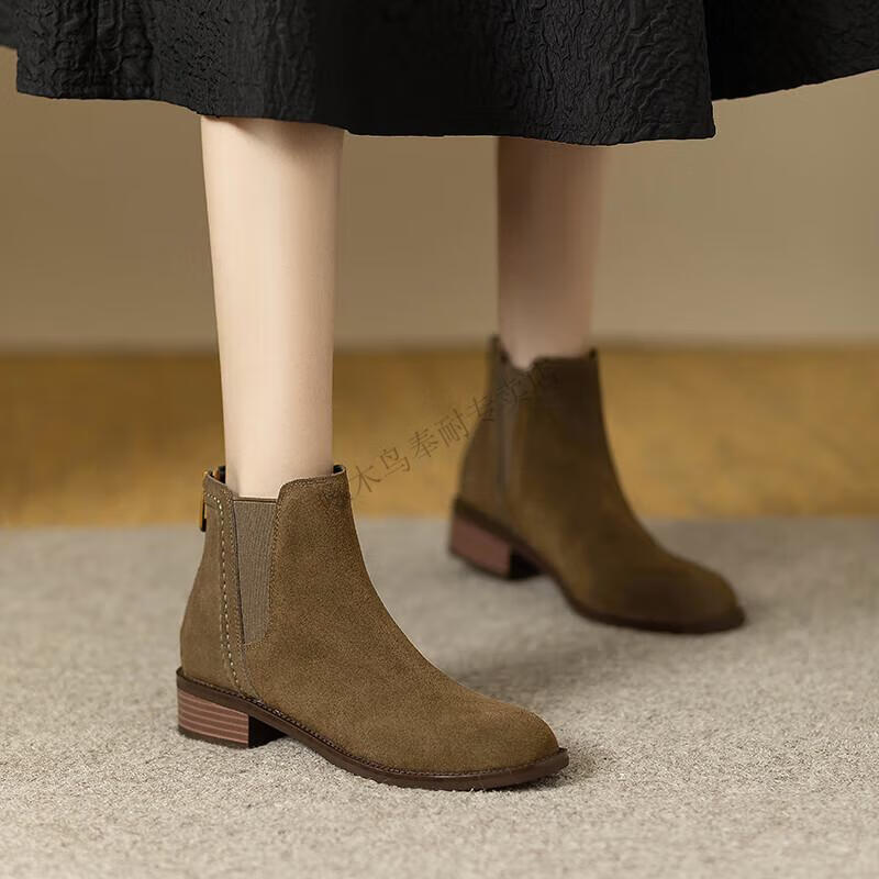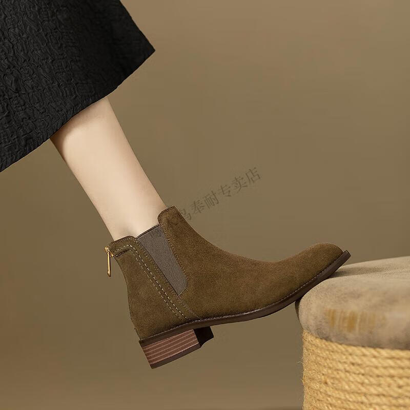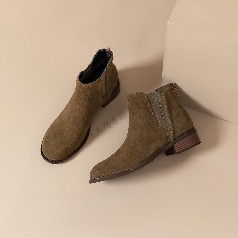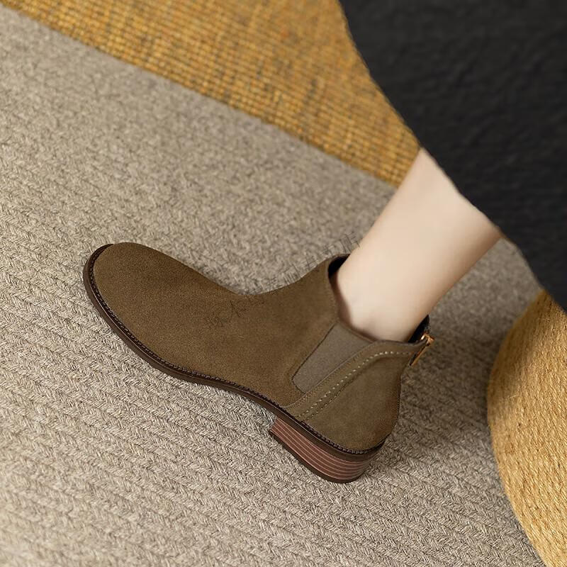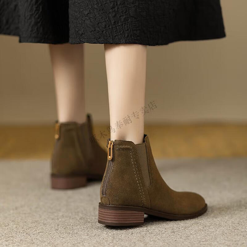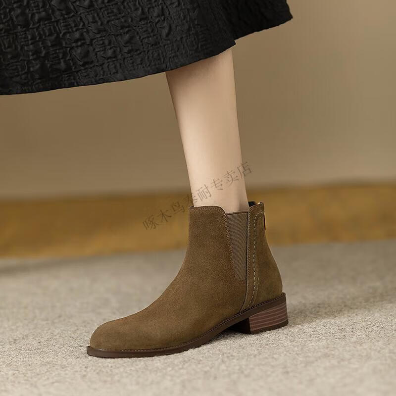 Woodpecker genuine leather short boots for women Chelsea super soft retro 2025 new round toe frosted ankle boots thick heel British Martin boots for women khaki velvet lining 37
