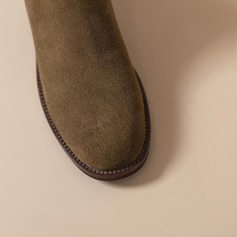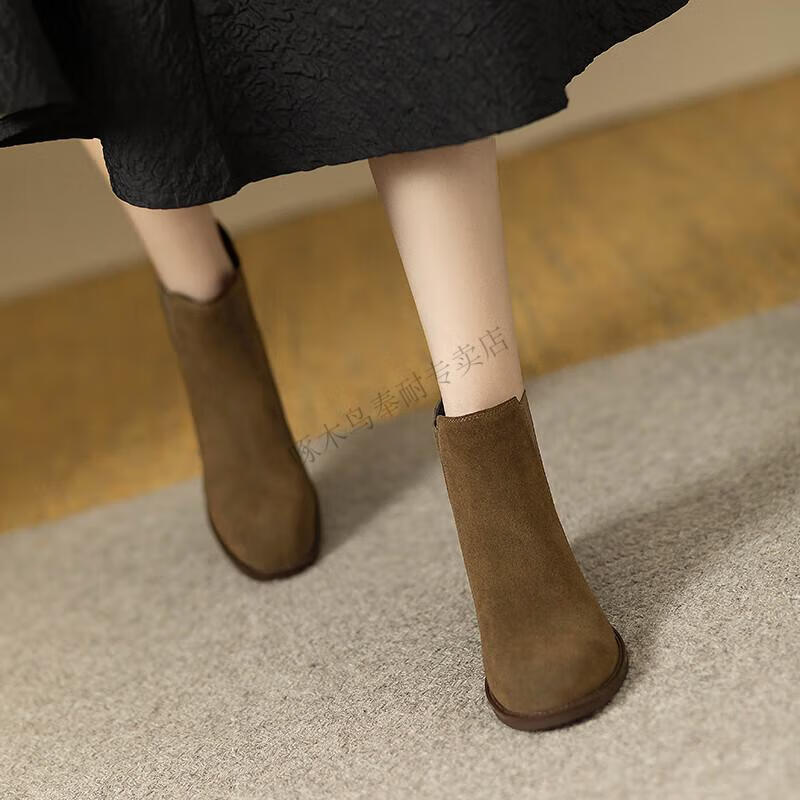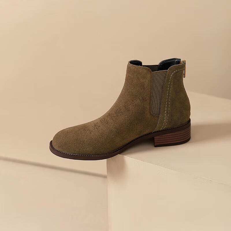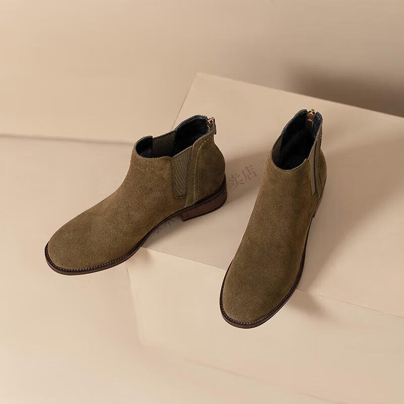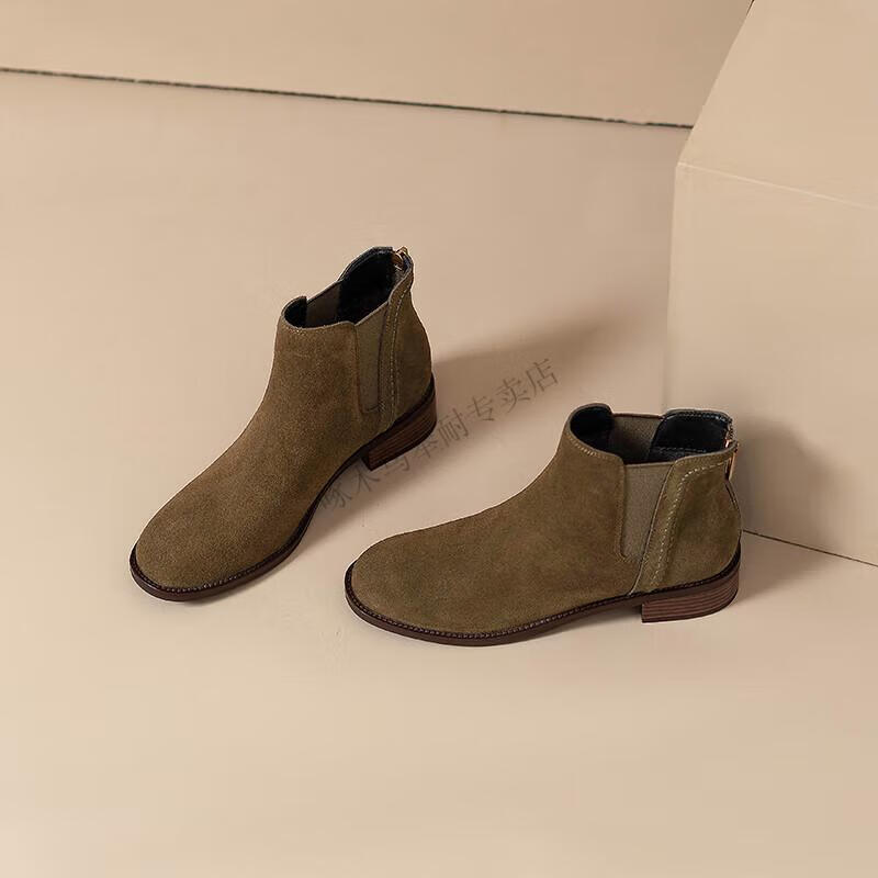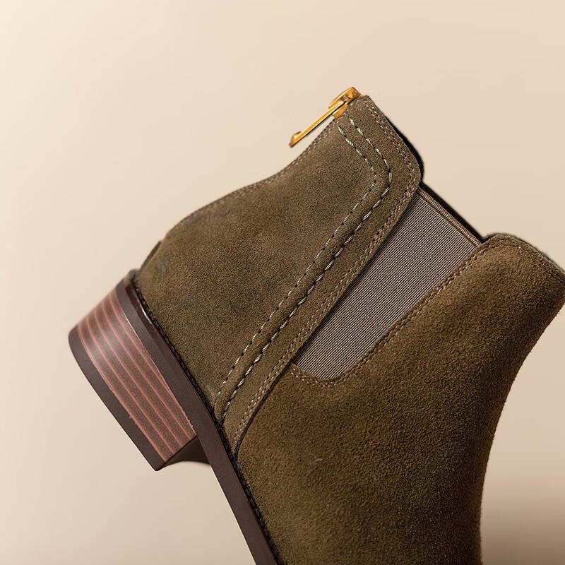 Woodpecker genuine leather short boots for women Chelsea super soft retro 2025 new round toe frosted ankle boots thick heel British Martin boots for women khaki velvet lining 37