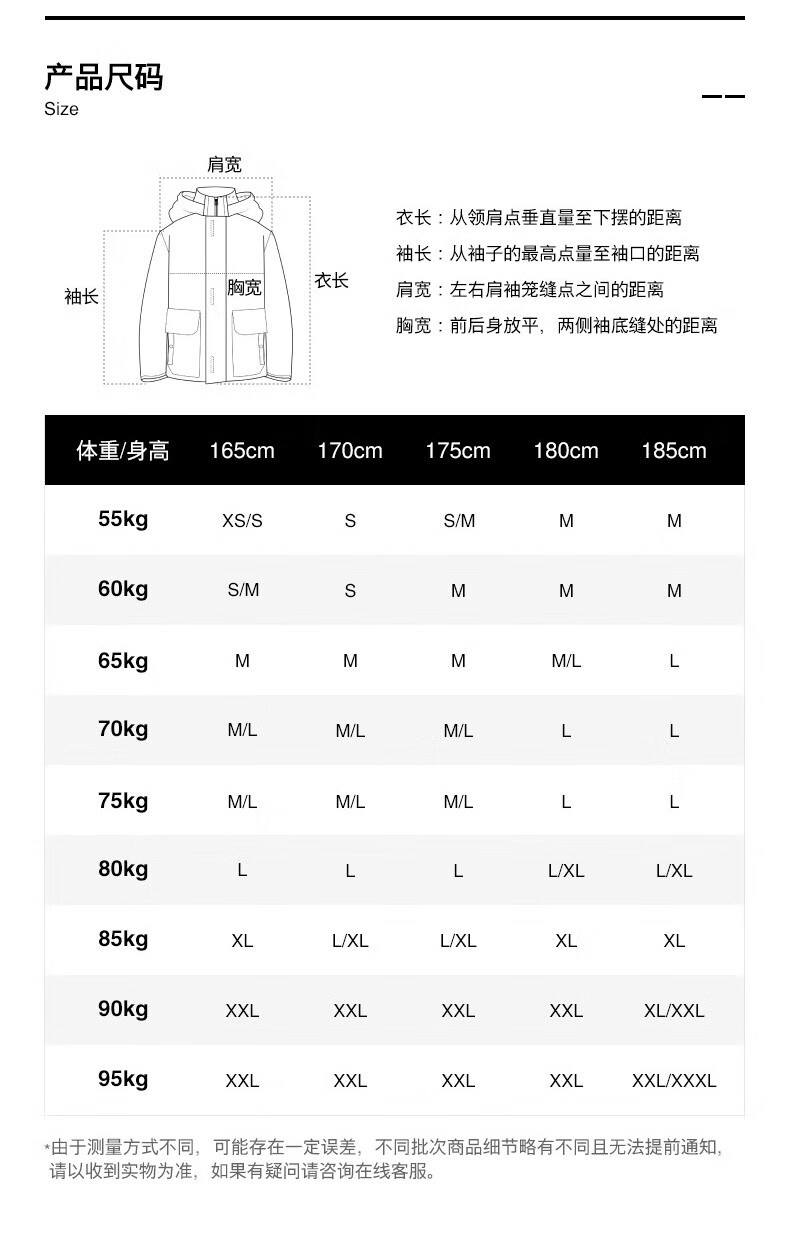 China (cm) 165 / 88-90 170 / 96-98 175 / 108-110 180 / 118-122 185 / 126-130