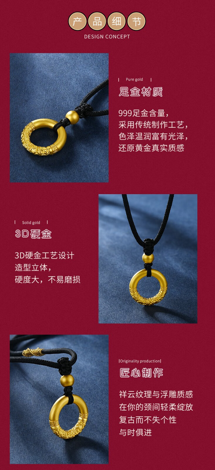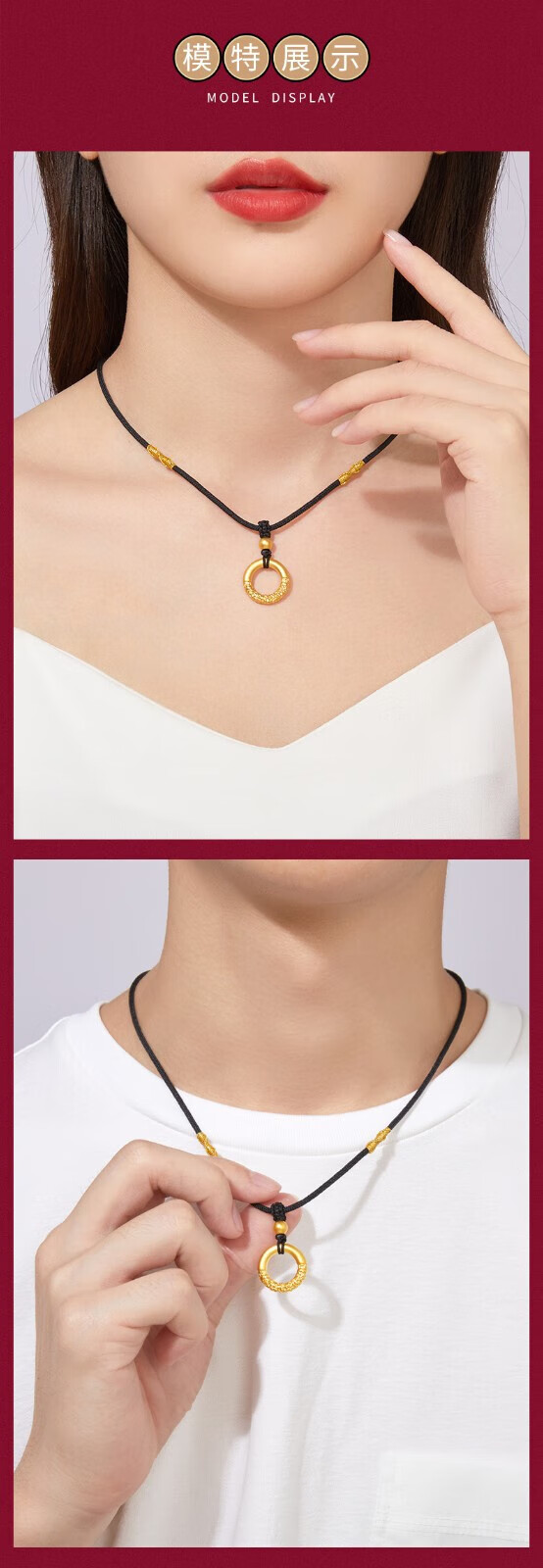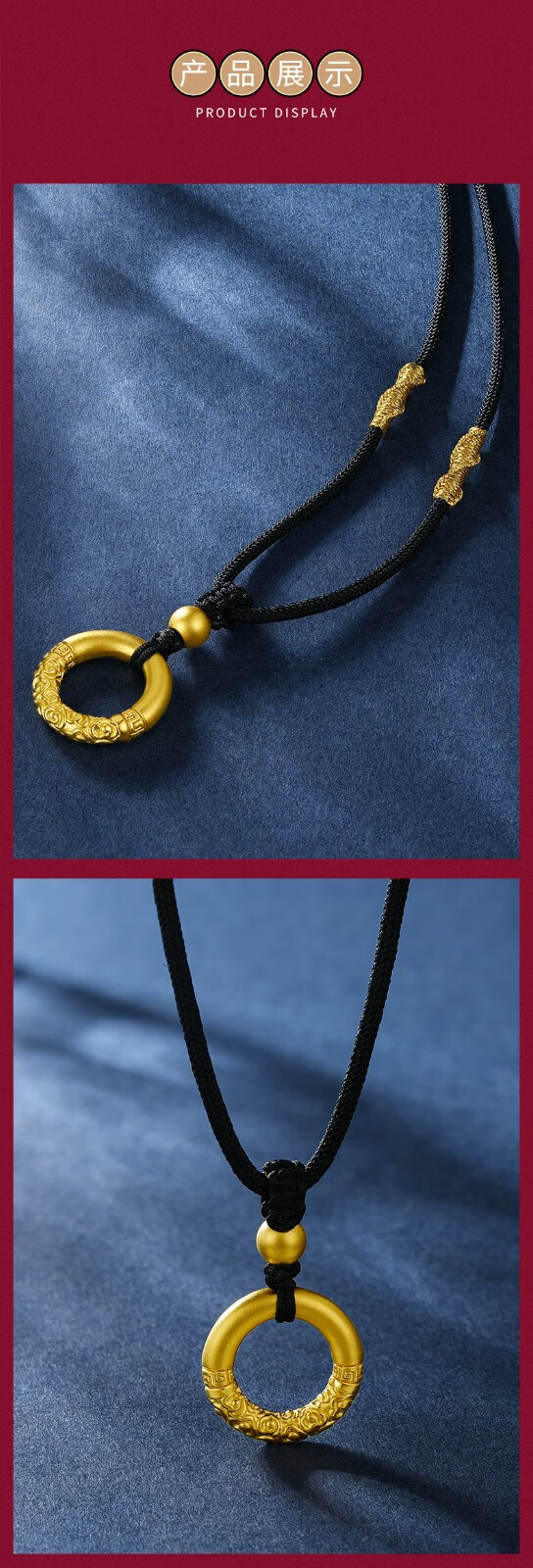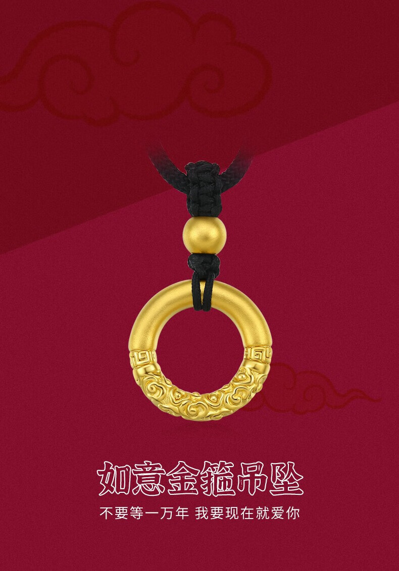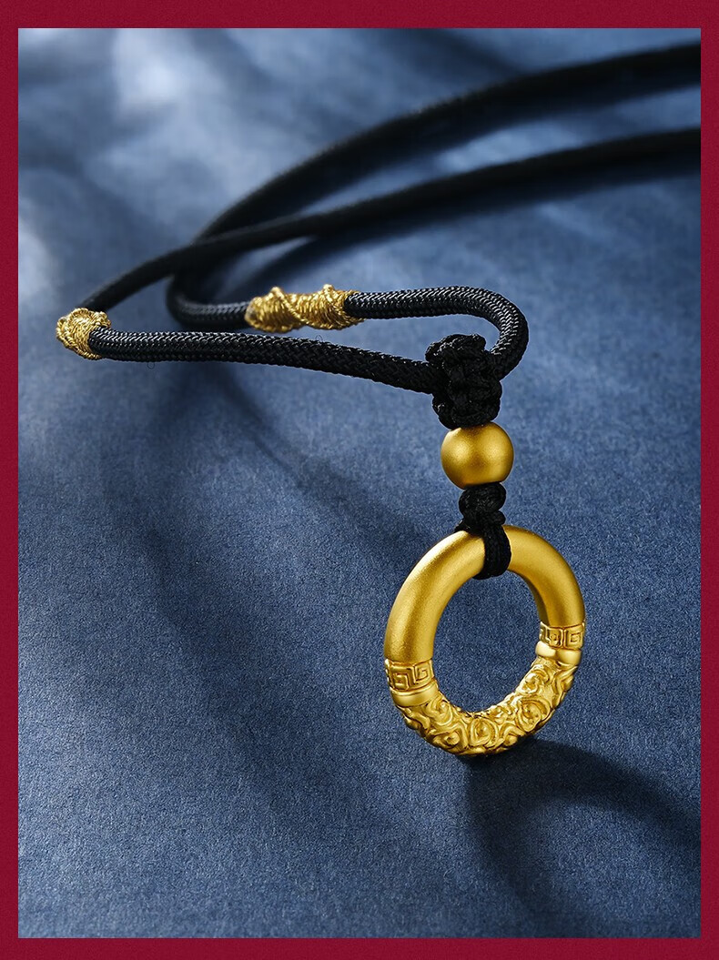 Chow Tai Fook 999 Pure Gold Peace Buckle Gold Pendant Men's Braided Necklace Letter Women's Ruyi Gold Hoop as Birthday Gift Gold Hoop + Gold Beads Black Rope