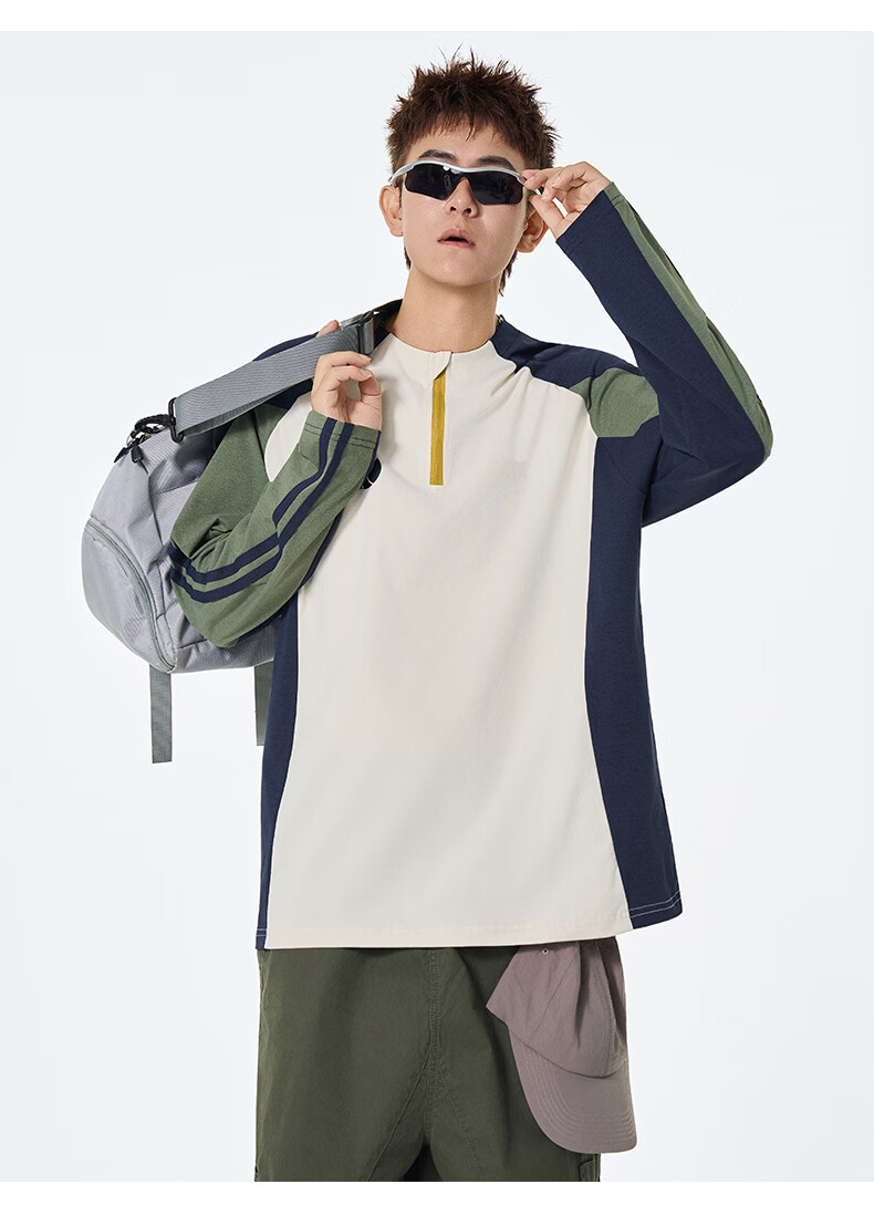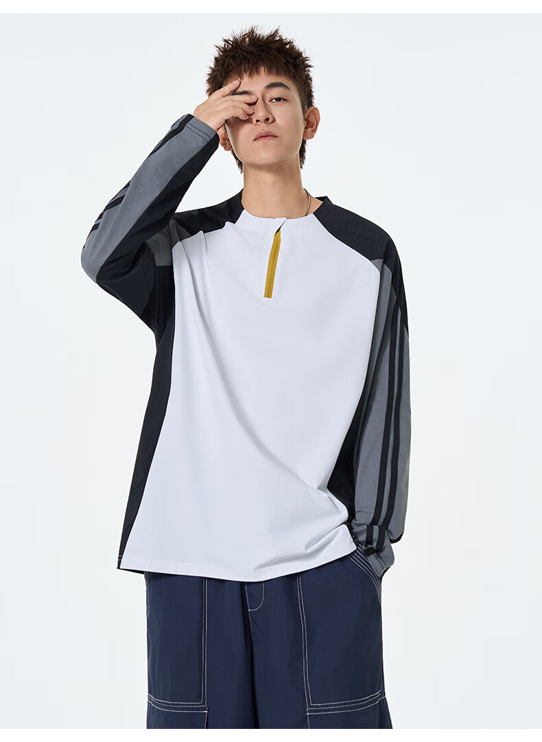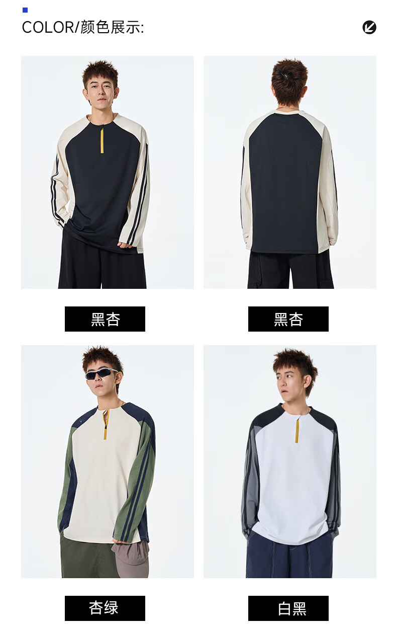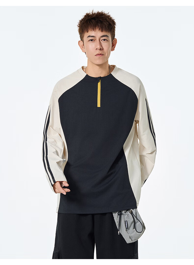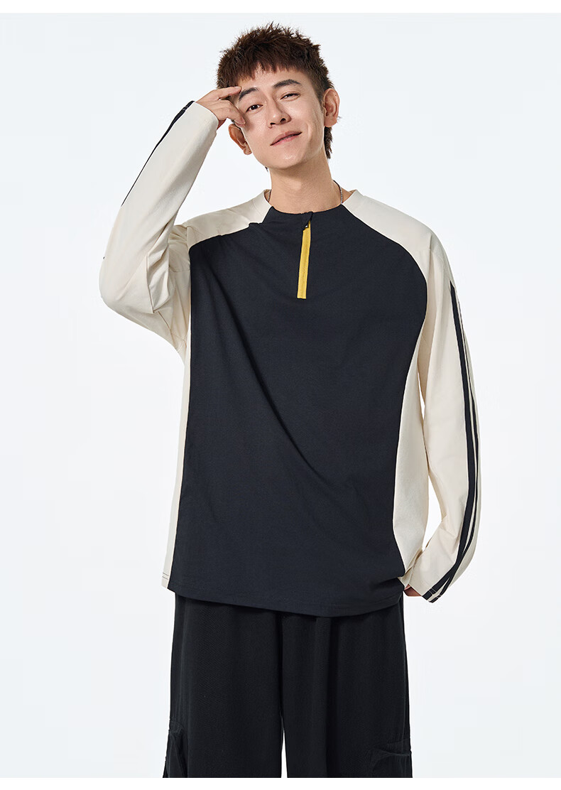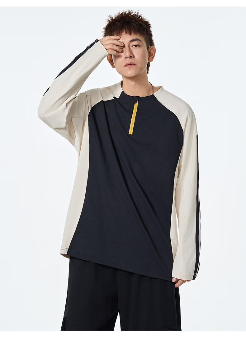 American retro contrasting color splicing half-zip quick-drying Henry collar long-sleeved T-shirt men's spring and autumn casual bottoming shirt trendy black apricot XL