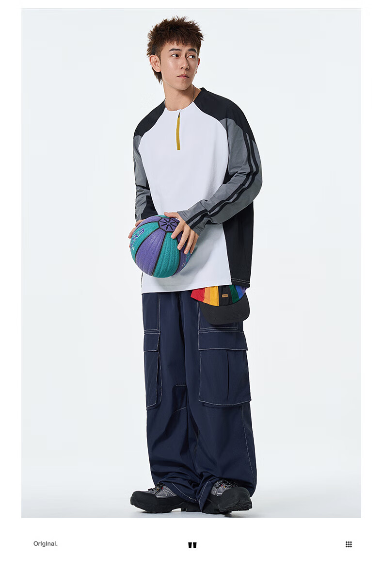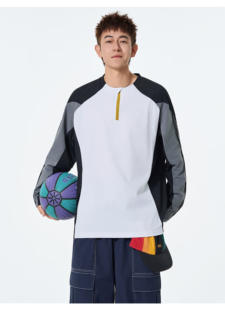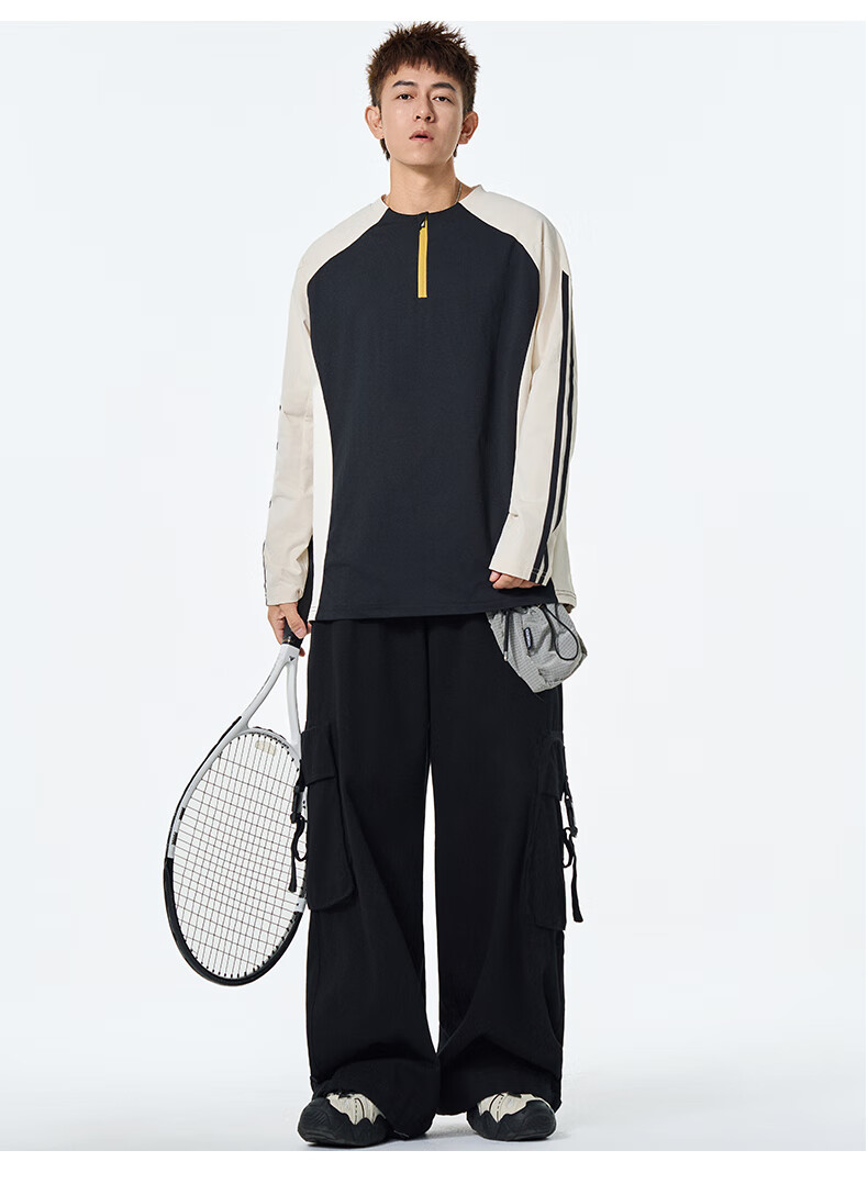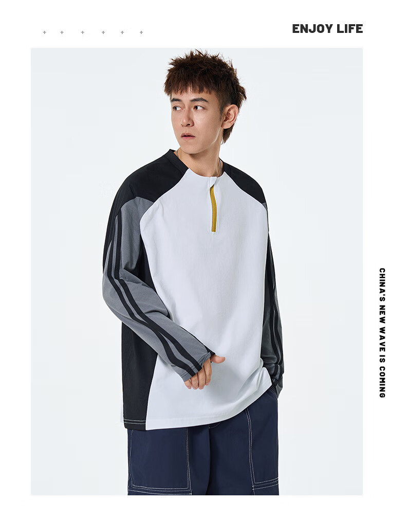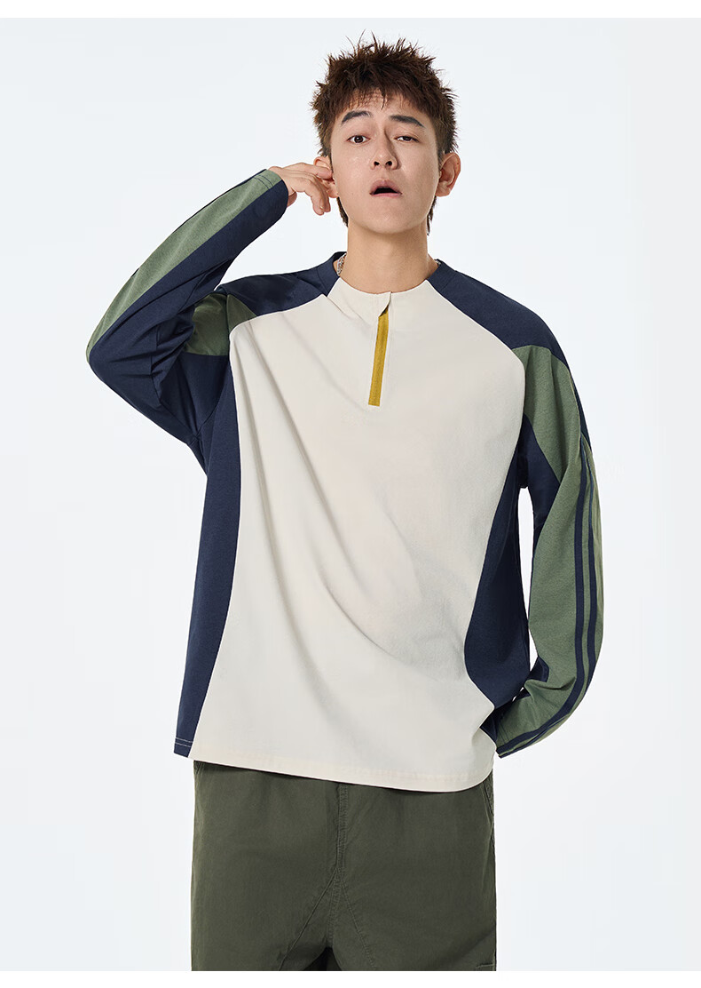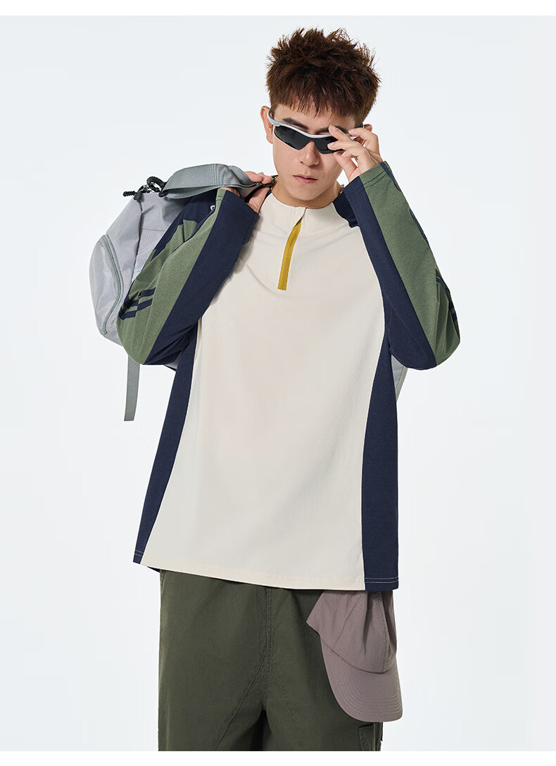 American retro contrasting color splicing half-zip quick-drying Henry collar long-sleeved T-shirt men's spring and autumn casual bottoming shirt trendy black apricot XL