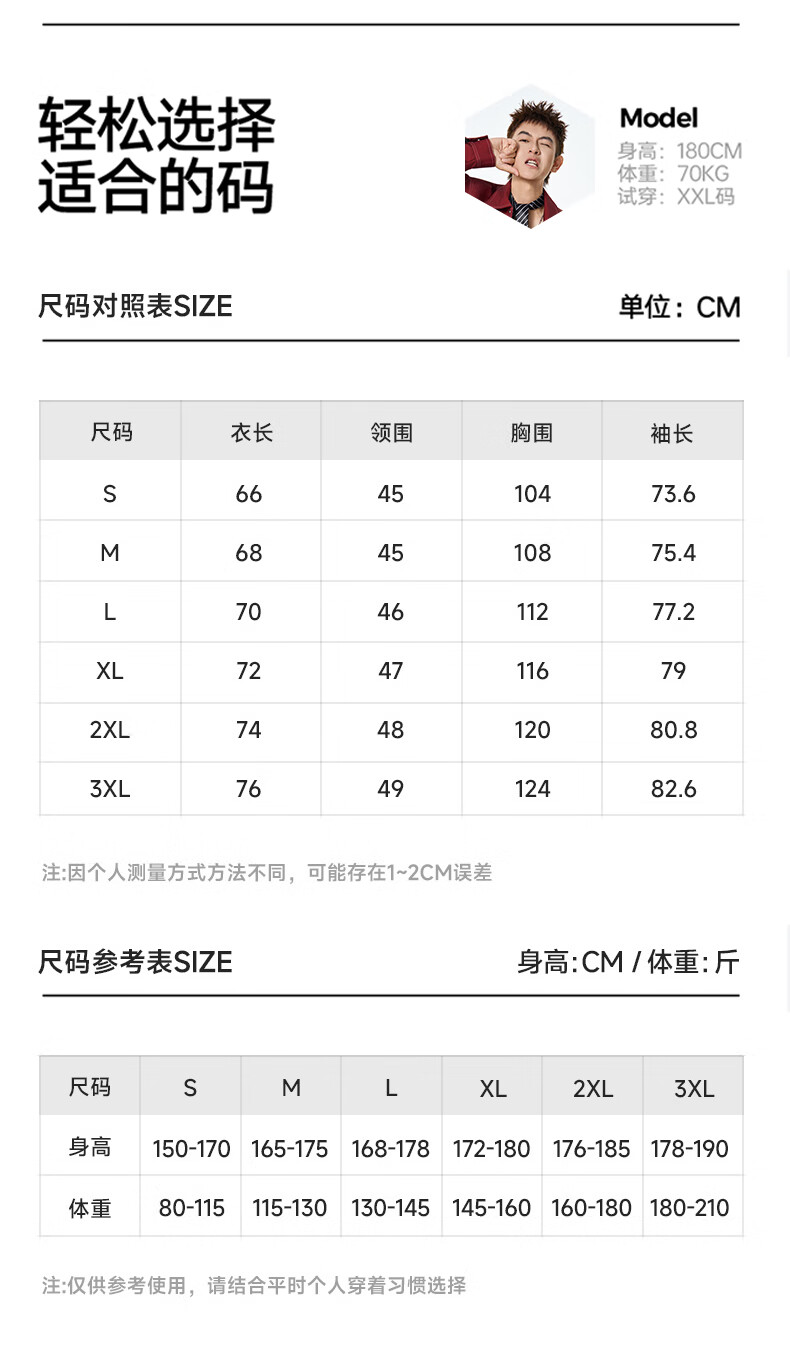 China (cm) 165 / 88-90 170 / 96-98 175 / 108-110 180 / 118-122 185 / 126-130