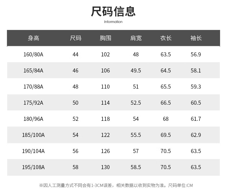 China (cm) 165 / 88-90 170 / 96-98 175 / 108-110 180 / 118-122 185 / 126-130