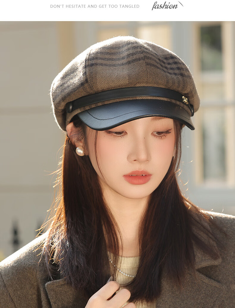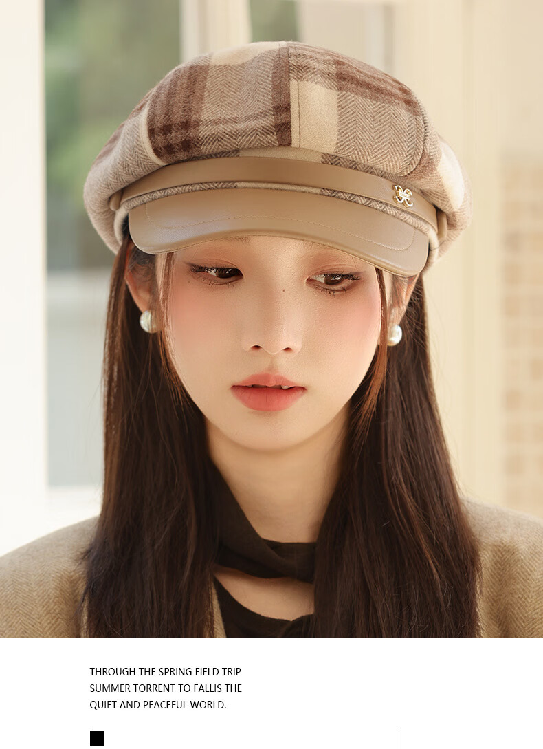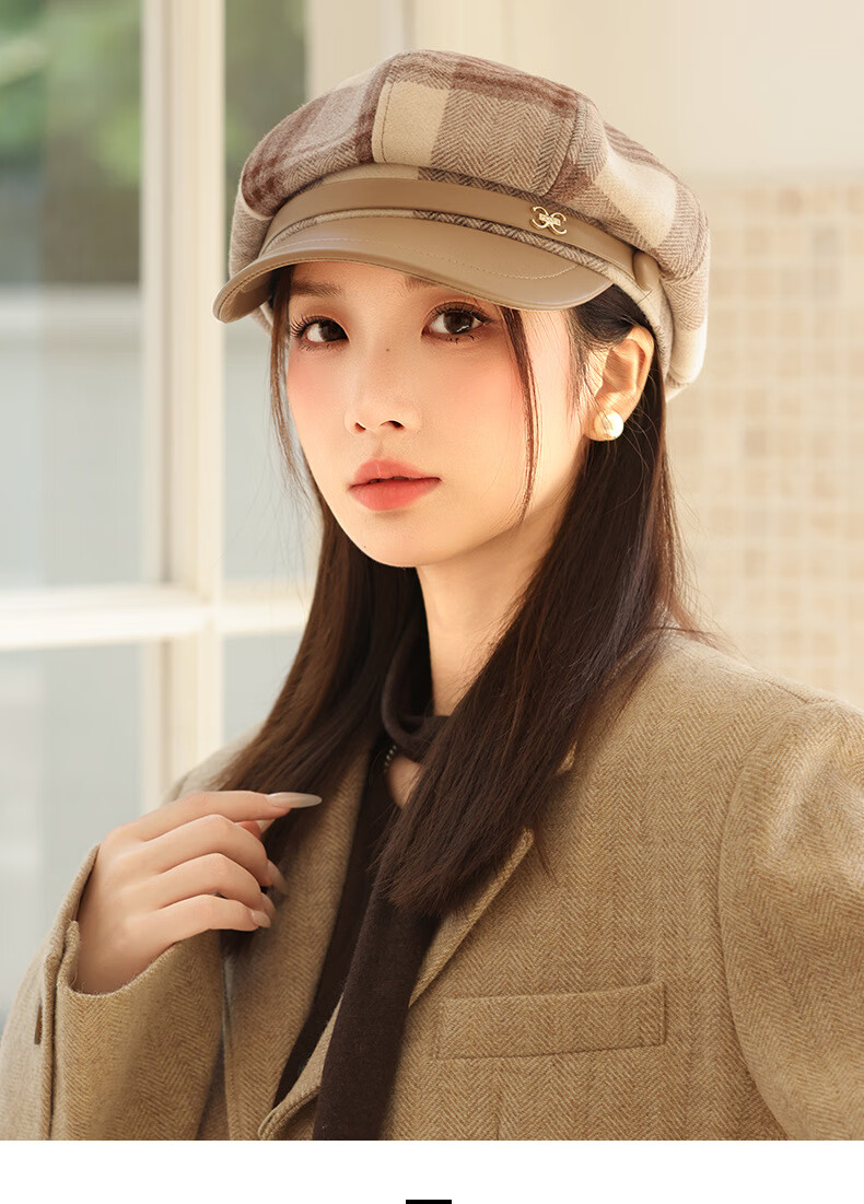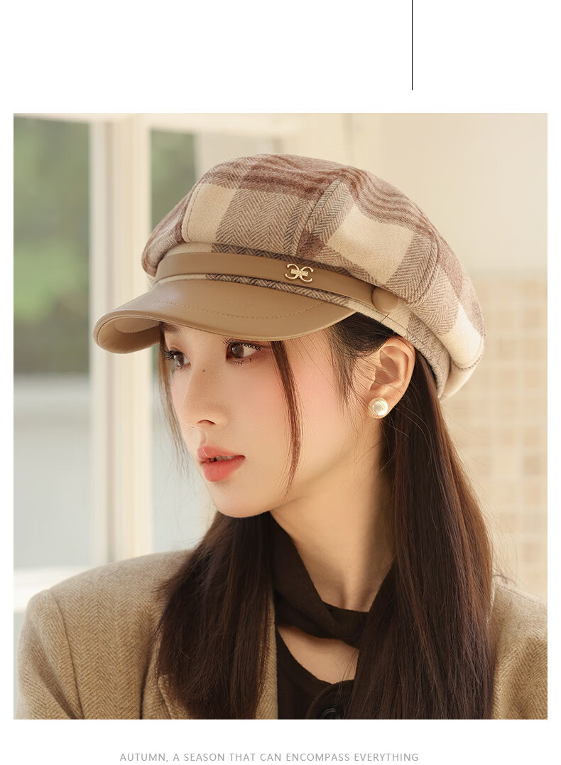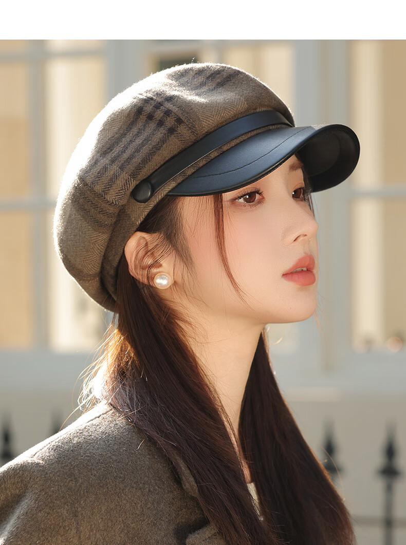 Jimmy Leaf Octagon Hat Women's Autumn and Winter Plaid Beret Casual and Versatile British Style Peaked Hat Warm Painter Hat Coffee One-size-fits-all Head Circumference 55-58CM
