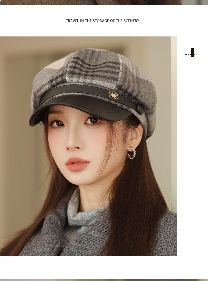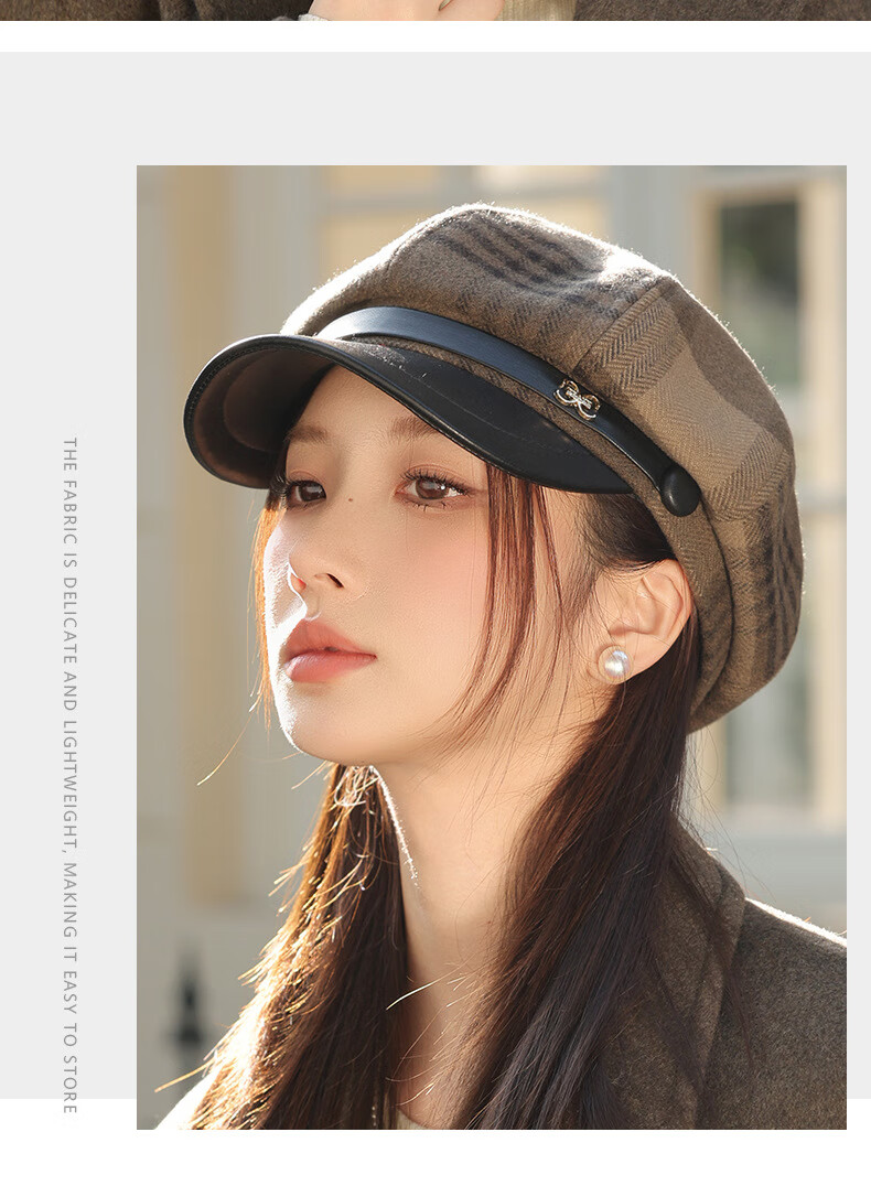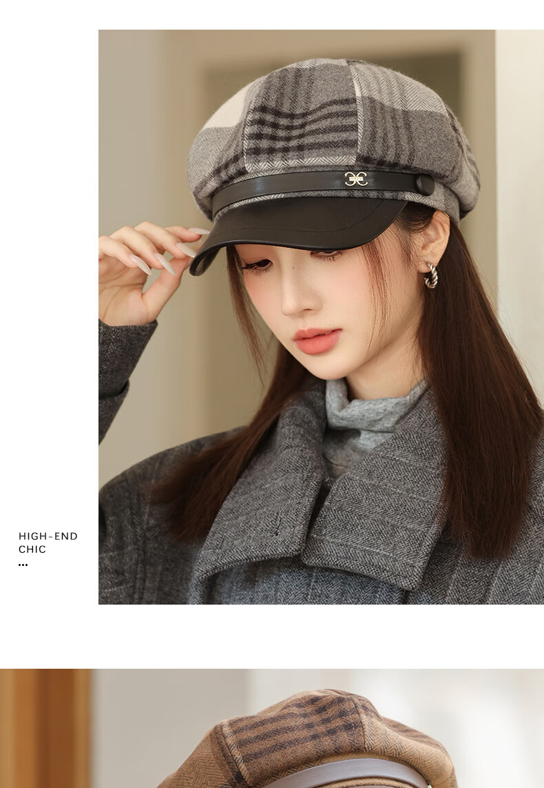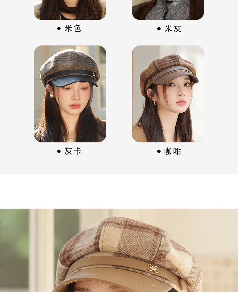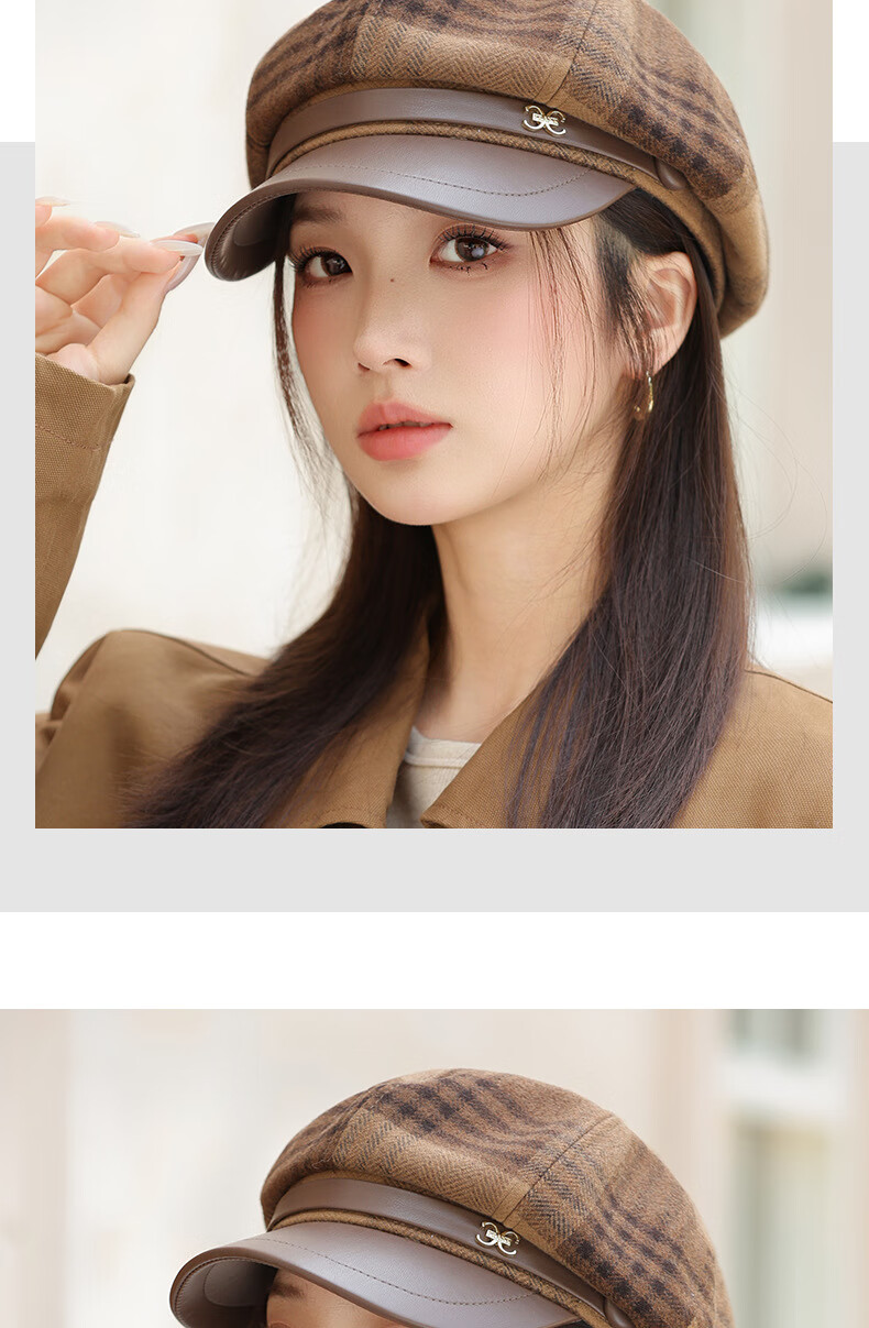 Jimmy Leaf Octagon Hat Women's Autumn and Winter Plaid Beret Casual and Versatile British Style Peaked Hat Warm Painter Hat Coffee One-size-fits-all Head Circumference 55-58CM