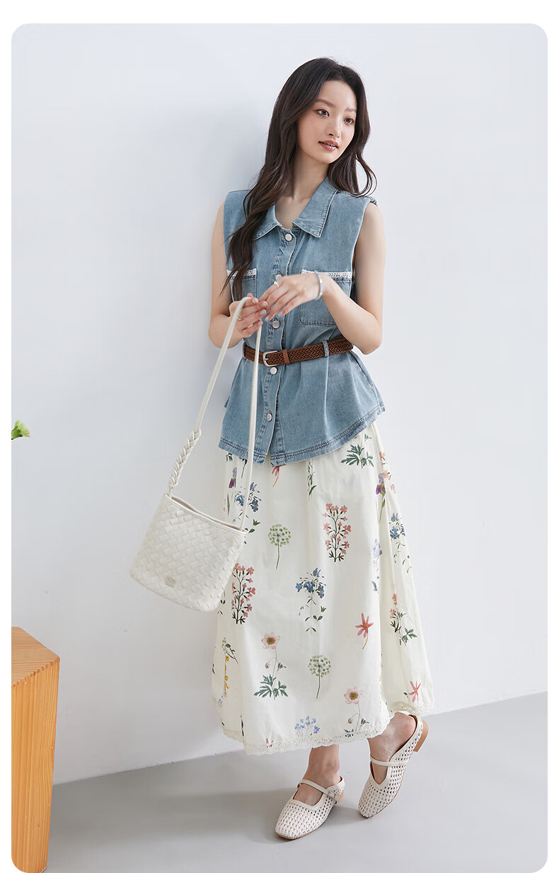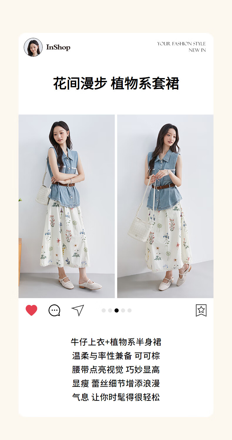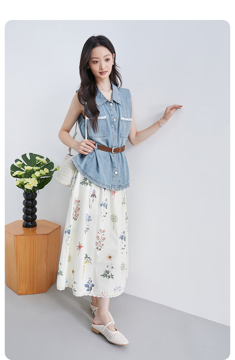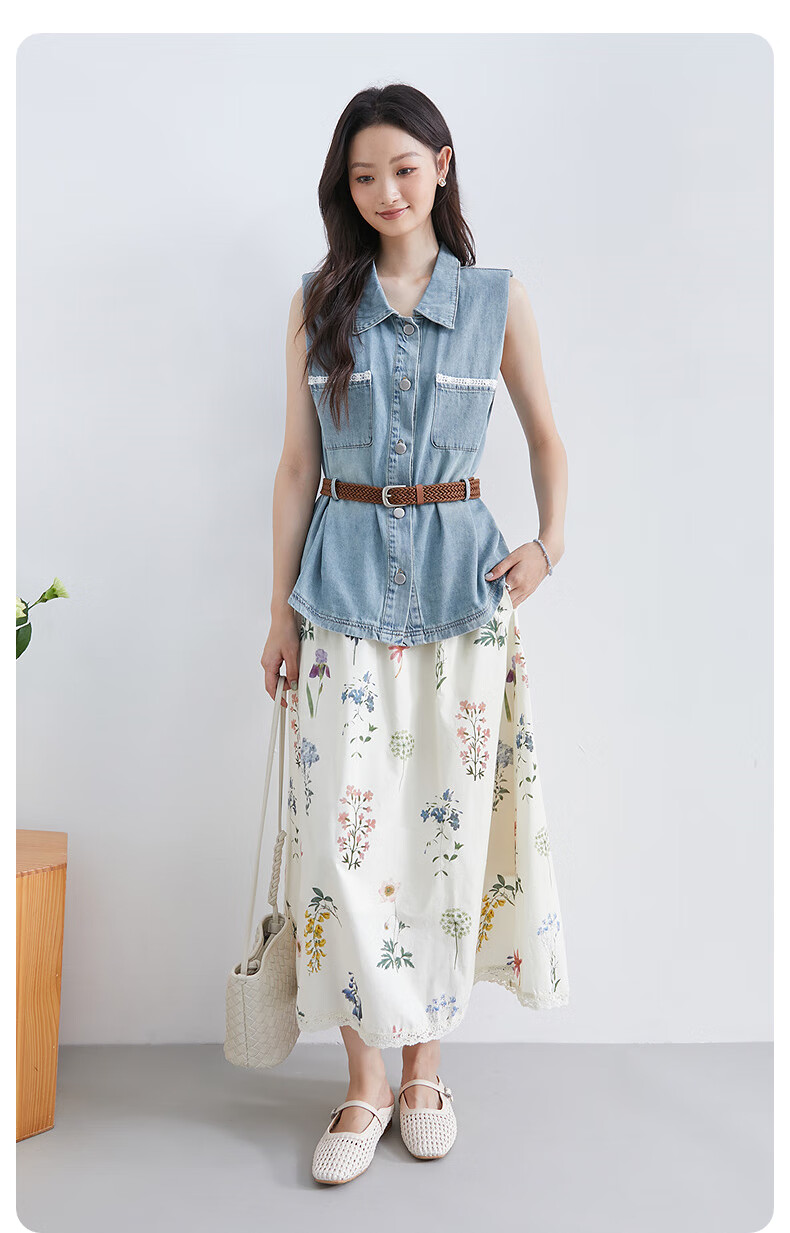 InShop shopping mall same style new denim vest jacket floral skirt commuting casual two-piece set light blue flower S