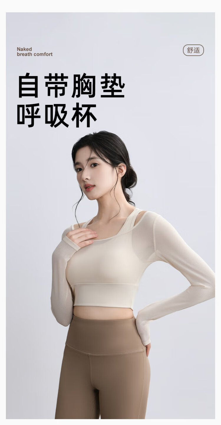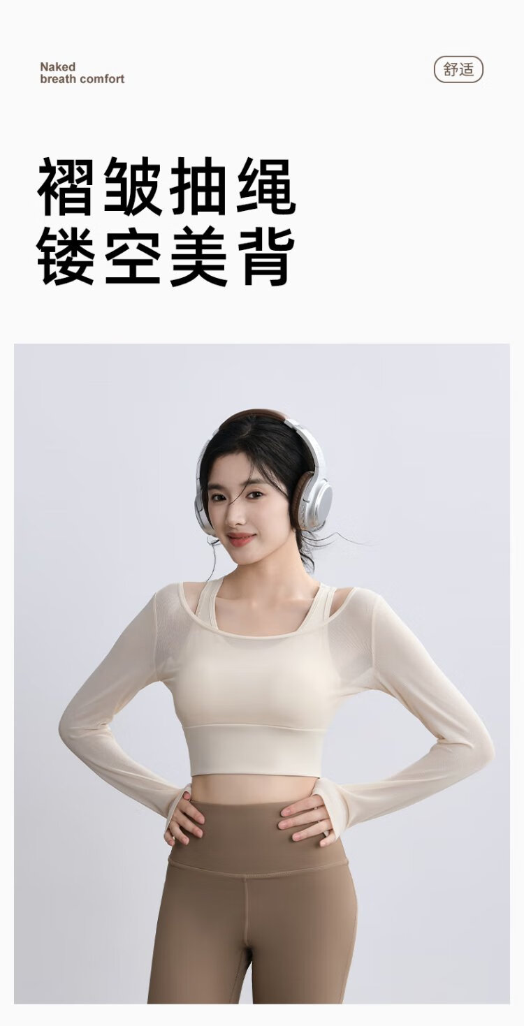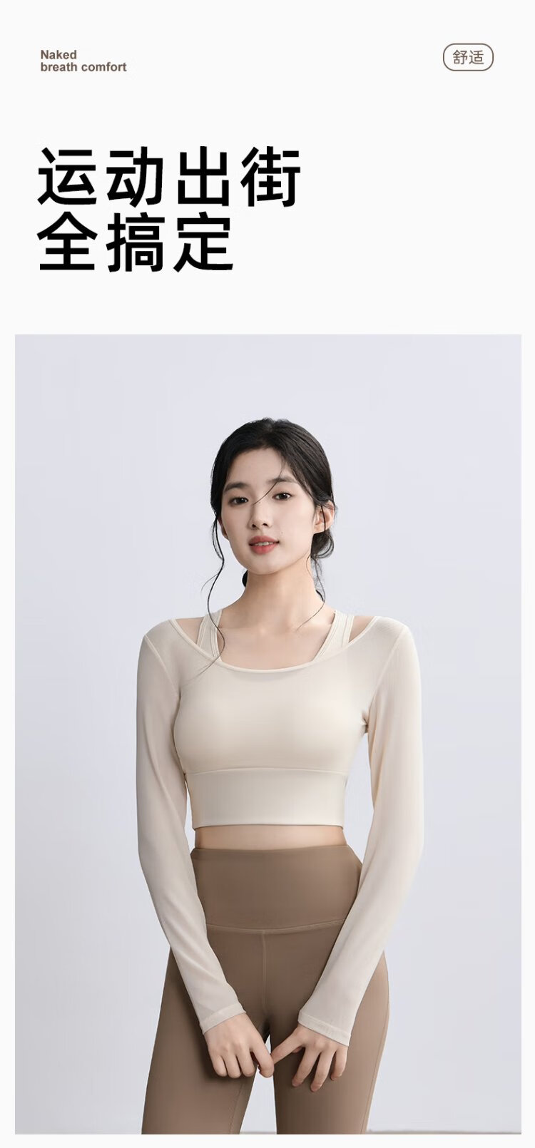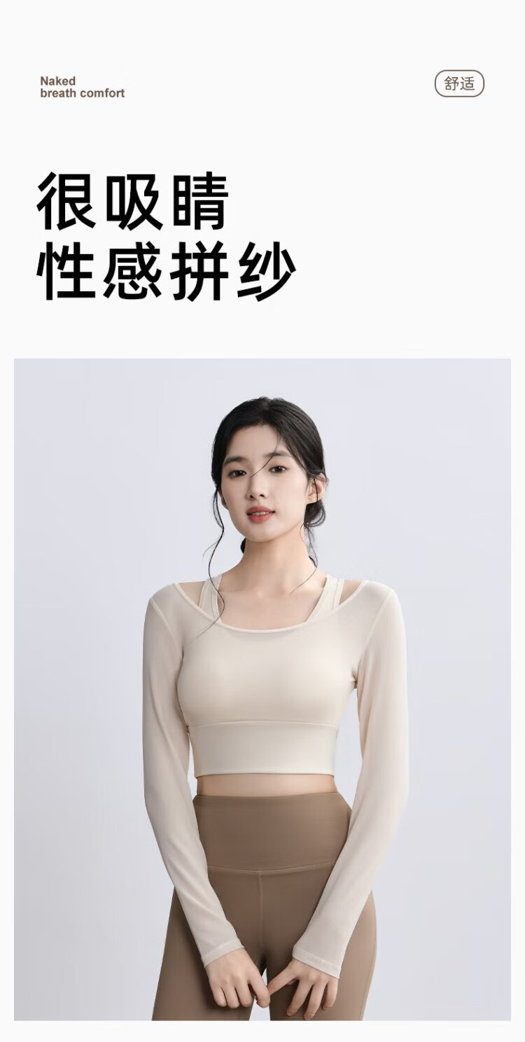 Fluniyu yoga wear women's new sports top with chest pad, long sleeves, fashionable running Pilates training fitness suit, ivory white + cocoa color XL (recommended 115-130 Jin Jin equals 0.5 kg)