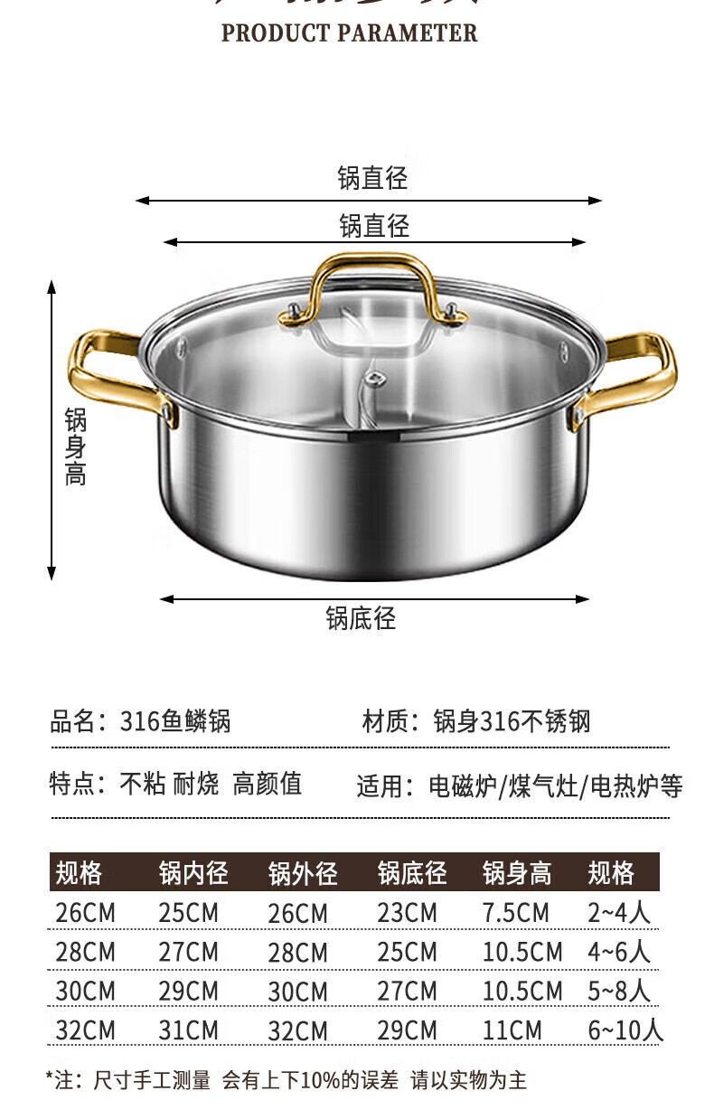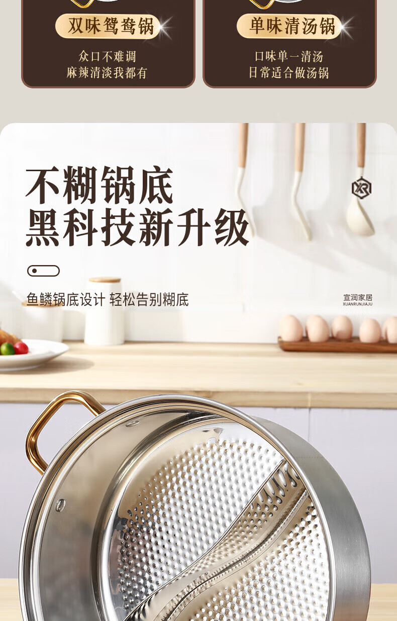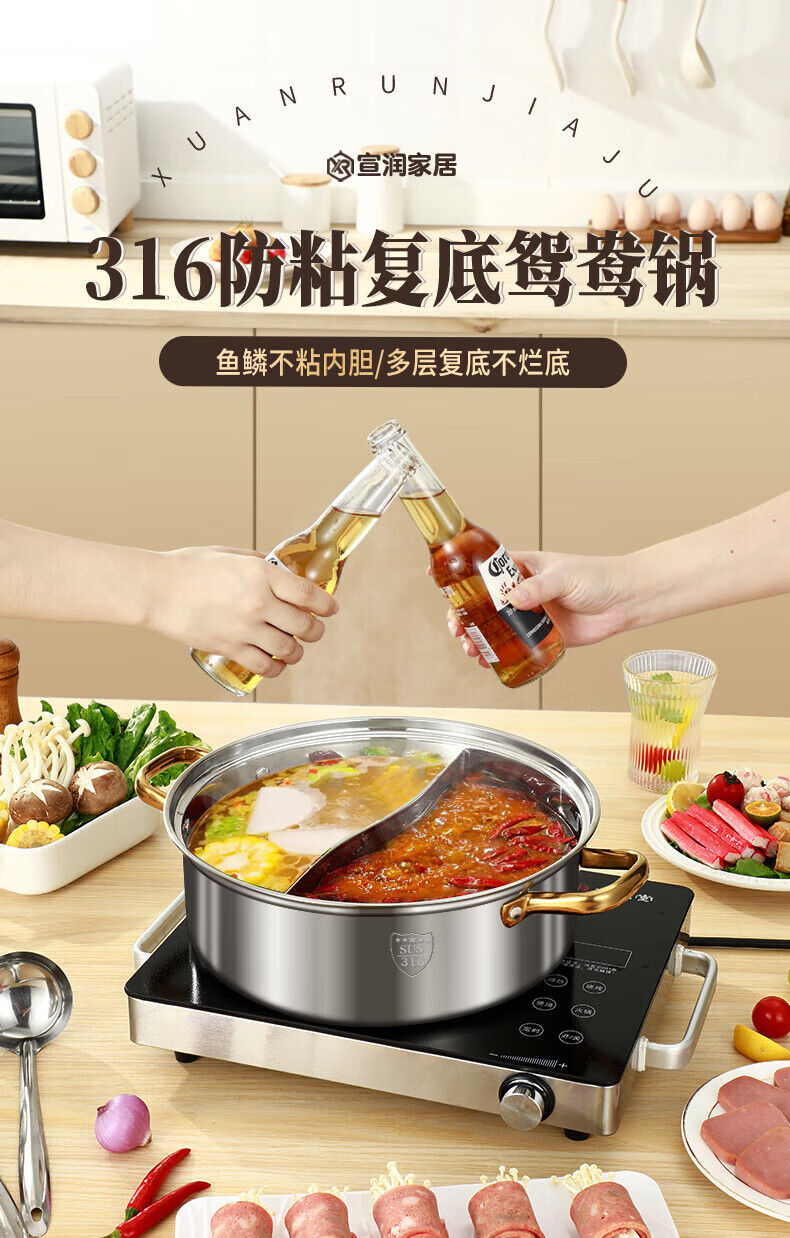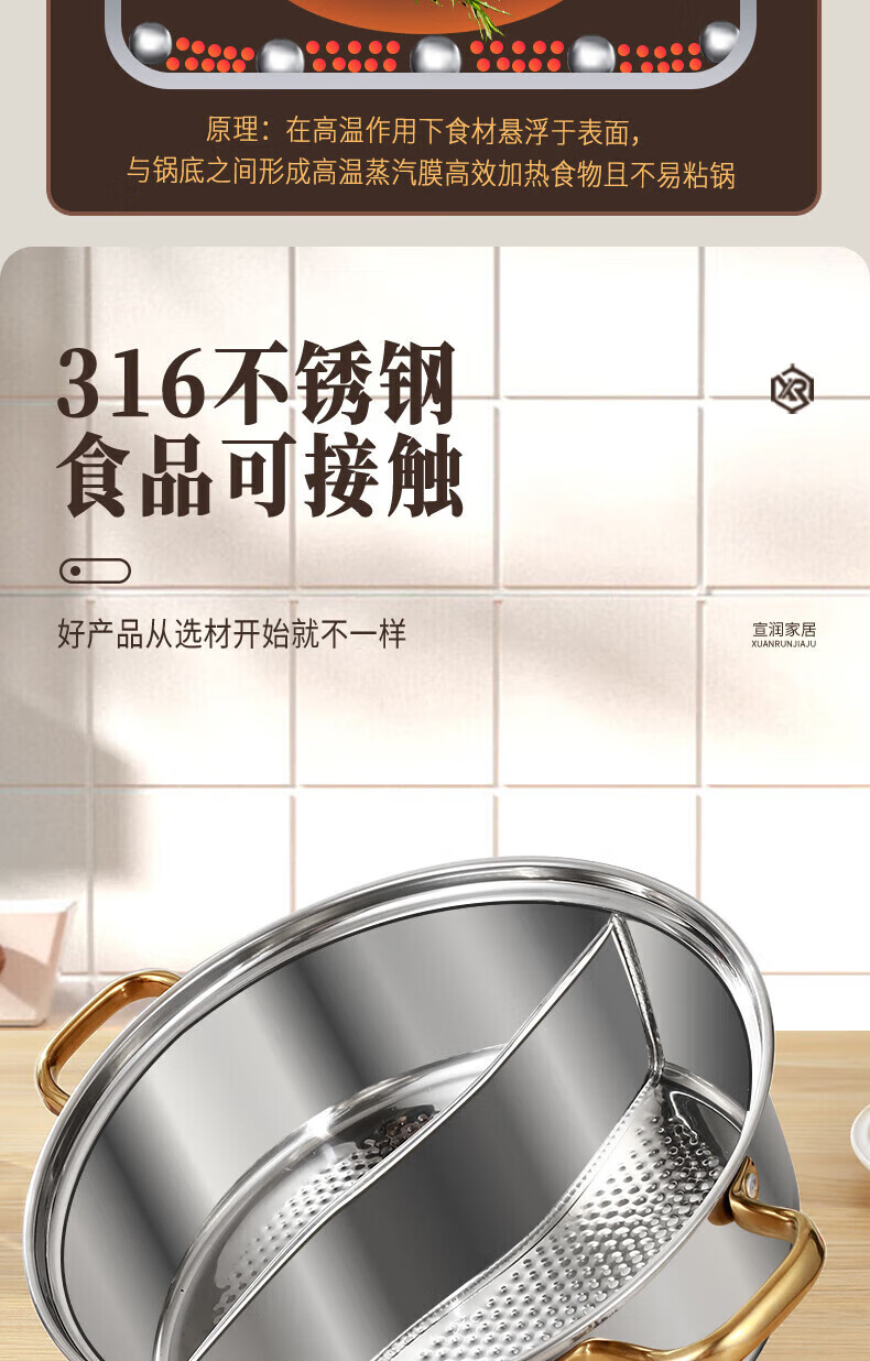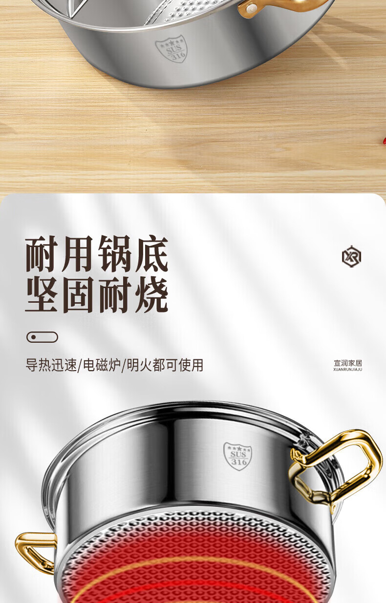 Fat Donglai Food Grade 316 Stainless Steel Yuanyang Pot Hot Pot Household Induction Cooker Special Pot Fat Donglai Same Style Yuanyang Pot 6-10 People Free Soup Spoon Colander_ 32cm