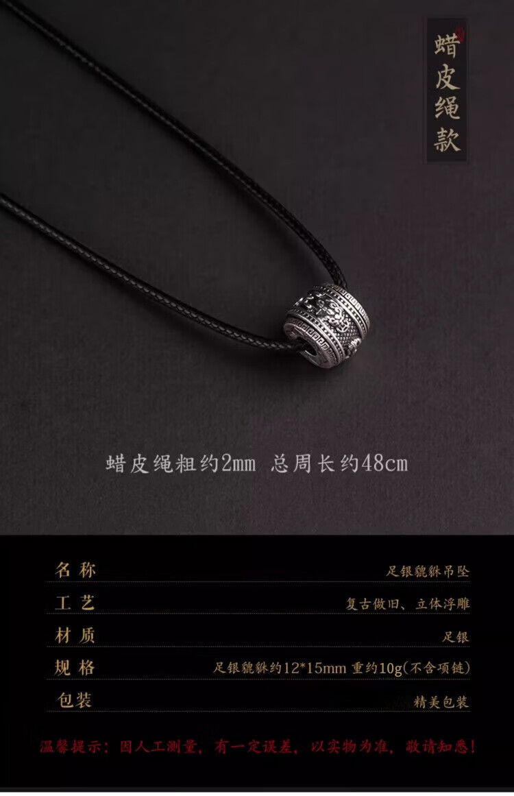 999 pure silver Pixiu pendant for men, trendy retro Thai silver necklace jewelry, good luck passerby pendant for boyfriend, wax leather rope style, everything goes well gift box