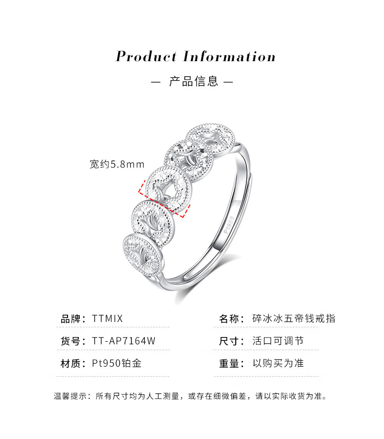 TTMIX Five Emperors' Money Platinum Ring Crushed Ice Ice pt950 Platinum Ring Platinum Live Mouth Women's Ring Birthday Gift 3.7-3.9g