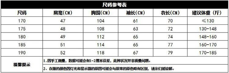 China (cm) 165 / 88-90 170 / 96-98 175 / 108-110 180 / 118-122 185 / 126-130