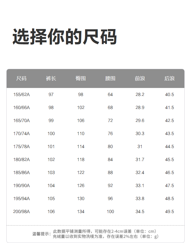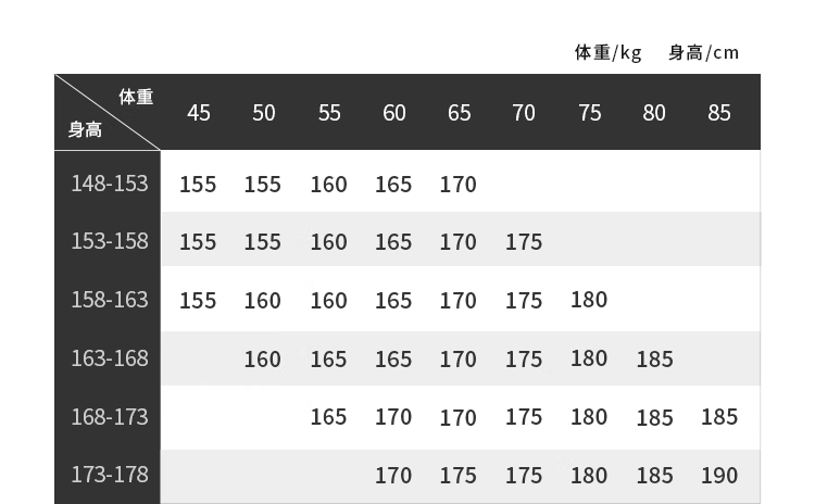 China (cm) 160-165/84-86 165-170 / 88-90 167-172 / 92-96 168-173 / 98-102 170-176 / 106-110