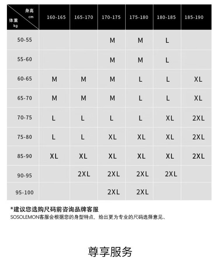 China (cm) 165 / 88-90 170 / 96-98 175 / 108-110 180 / 118-122 185 / 126-130