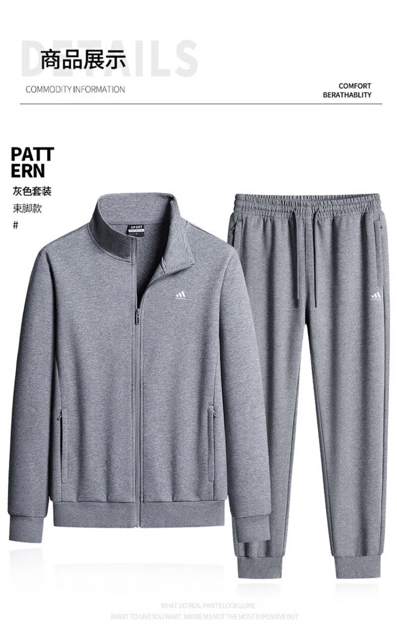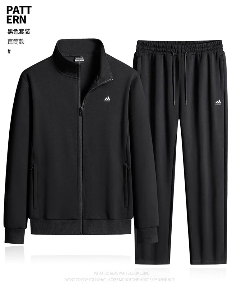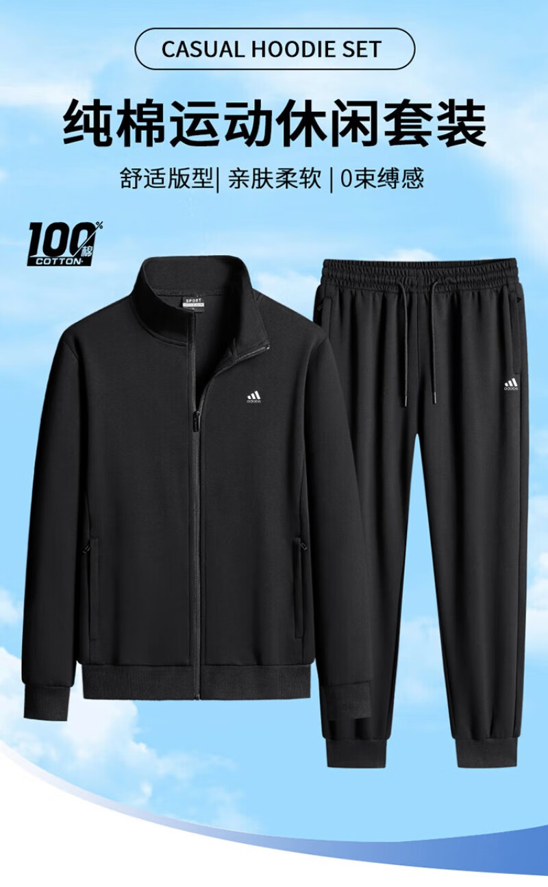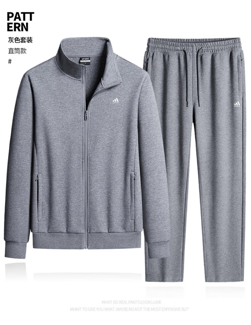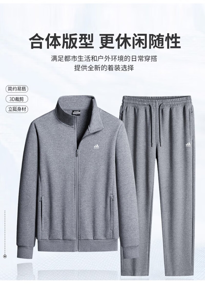 Adidas casual sports suit men's pure cotton winter velvet thickened stand-up collar middle-aged and elderly running fitness two-piece set stand-up collar gray straight (spring and autumn) 4XL recommended 170-190Jin Jin equals 0.5 kg