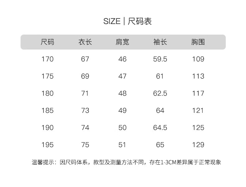 China (cm) 165 / 88-90 170 / 96-98 175 / 108-110 180 / 118-122 185 / 126-130