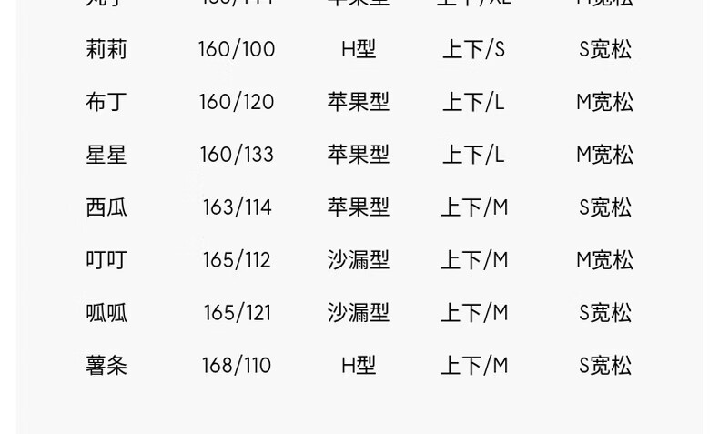China (cm) 160-165/84-86 165-170 / 88-90 167-172 / 92-96 168-173 / 98-102 170-176 / 106-110