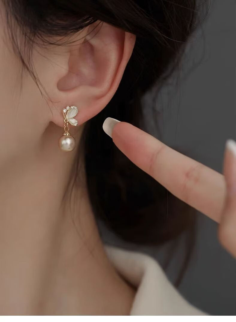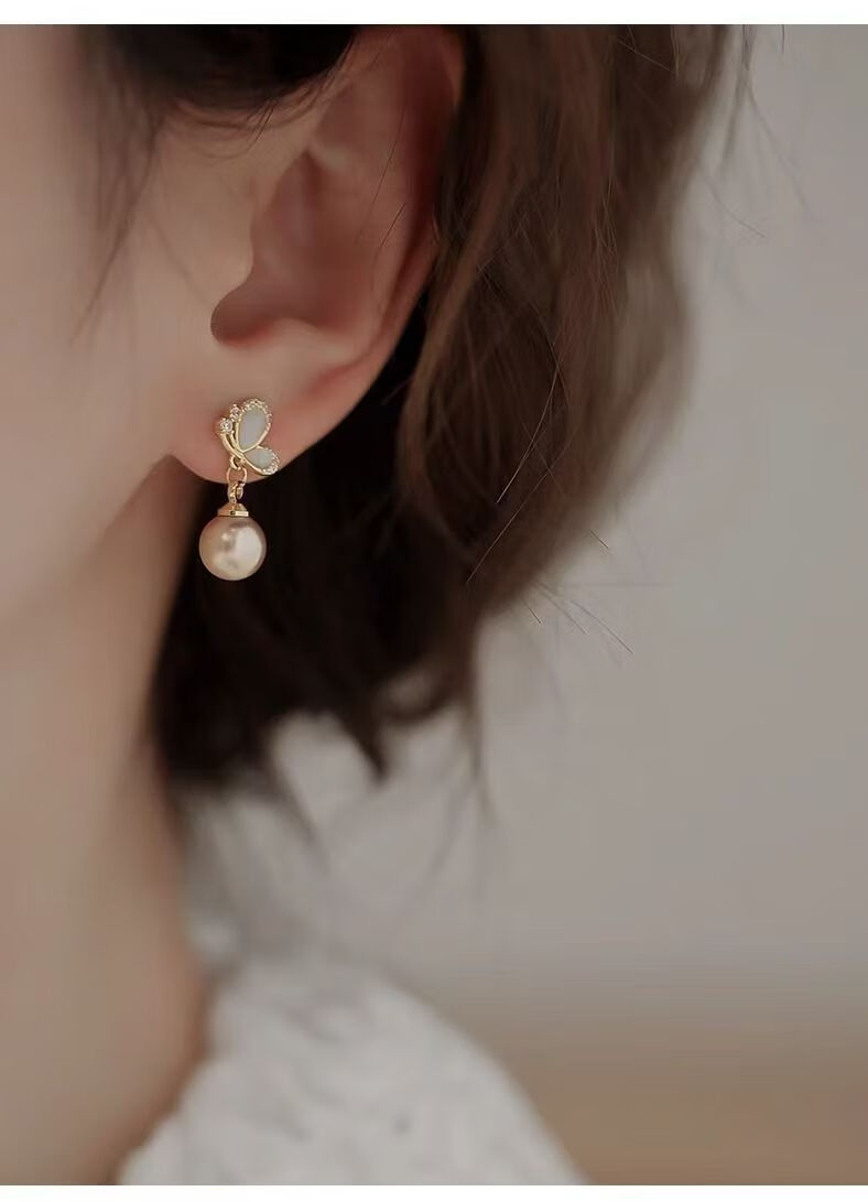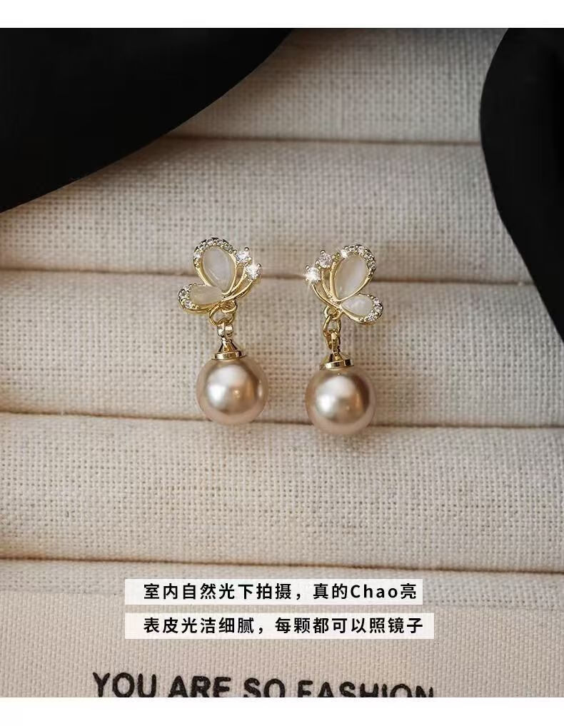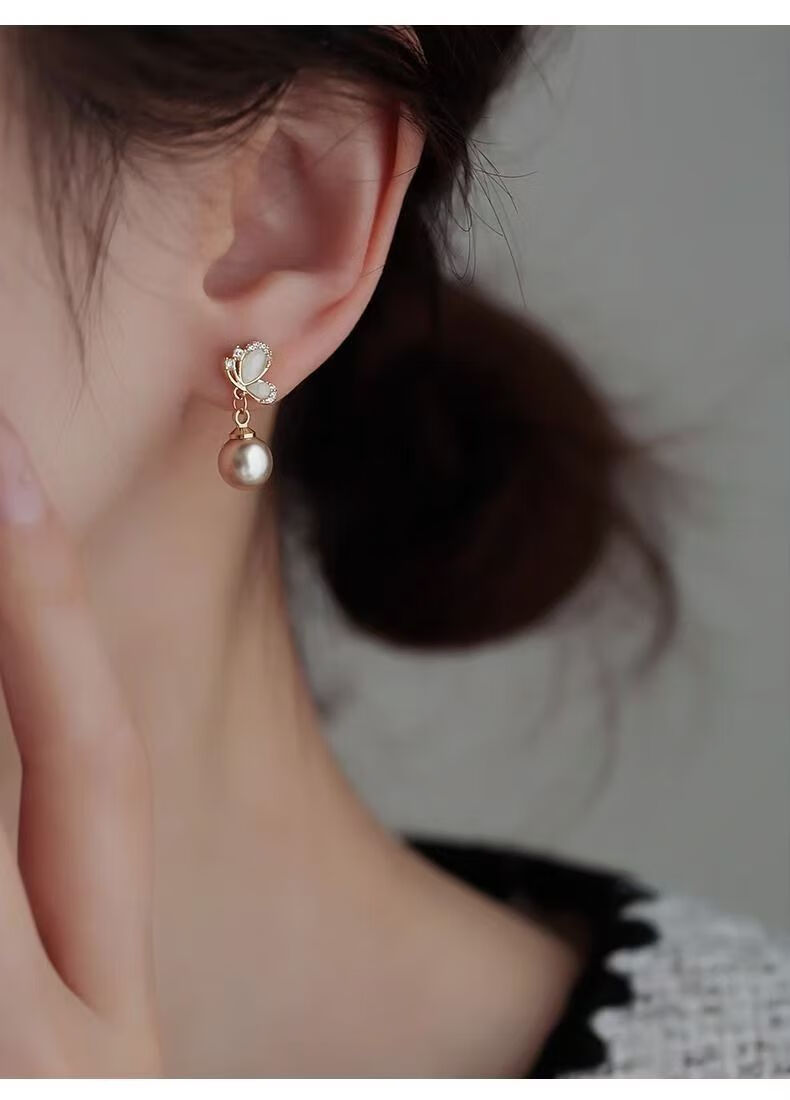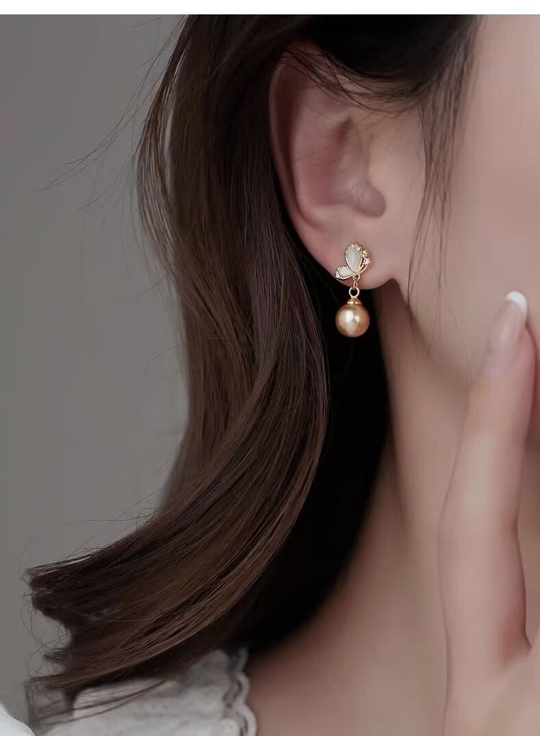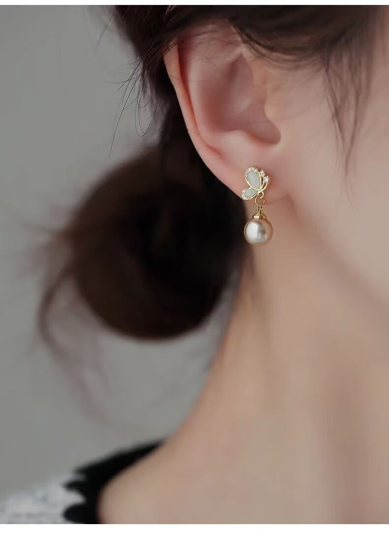 KZD Old Phoenix 999 pure silver pearl earrings temperament butterfly earrings for women anti-allergic niche French style sleep-free champagne color pearl sterling silver earrings 0.89g (silver single)