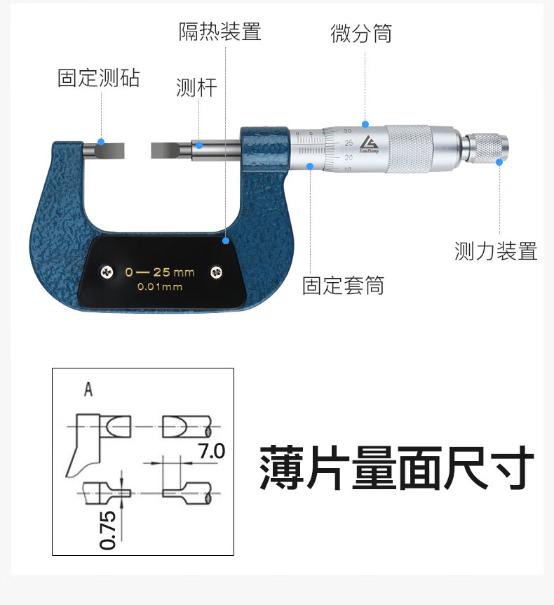 Harbin measuring three-quantity outer diameter thin blade blade micrometer 0-25-50mm0.7 keyway flat head slit slot card measurement 211-242 blade 25-50*0.75mm