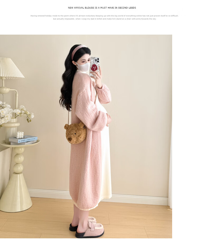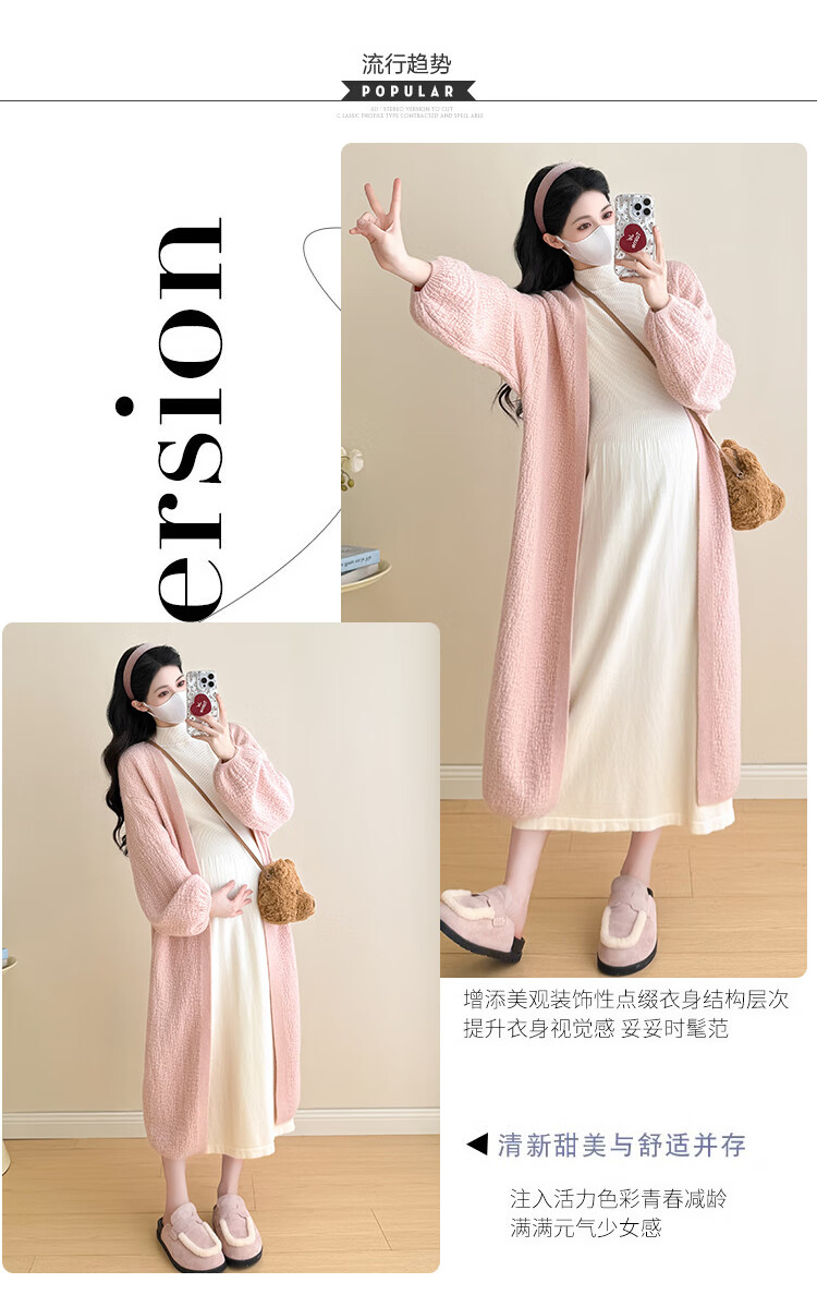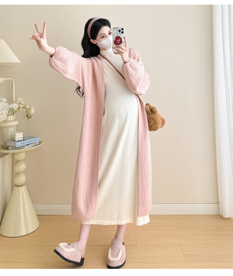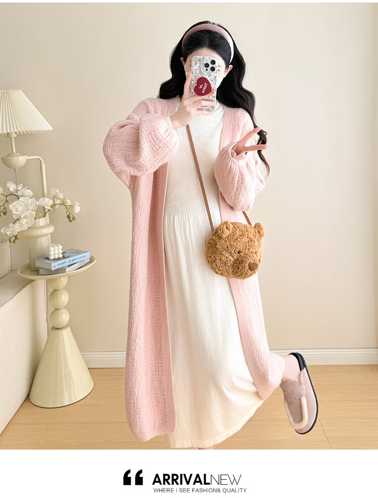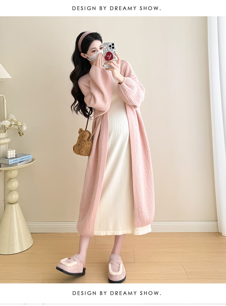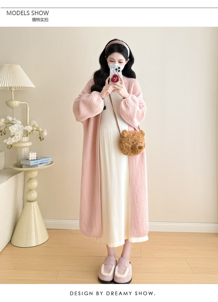 Nanding Yage Maternity Wear New Winter Bark Pattern Puff Sleeve Long Cardigan Jacket Knitted Dress Loose Lazy Suit Pink Jacket + Apricot Dress L