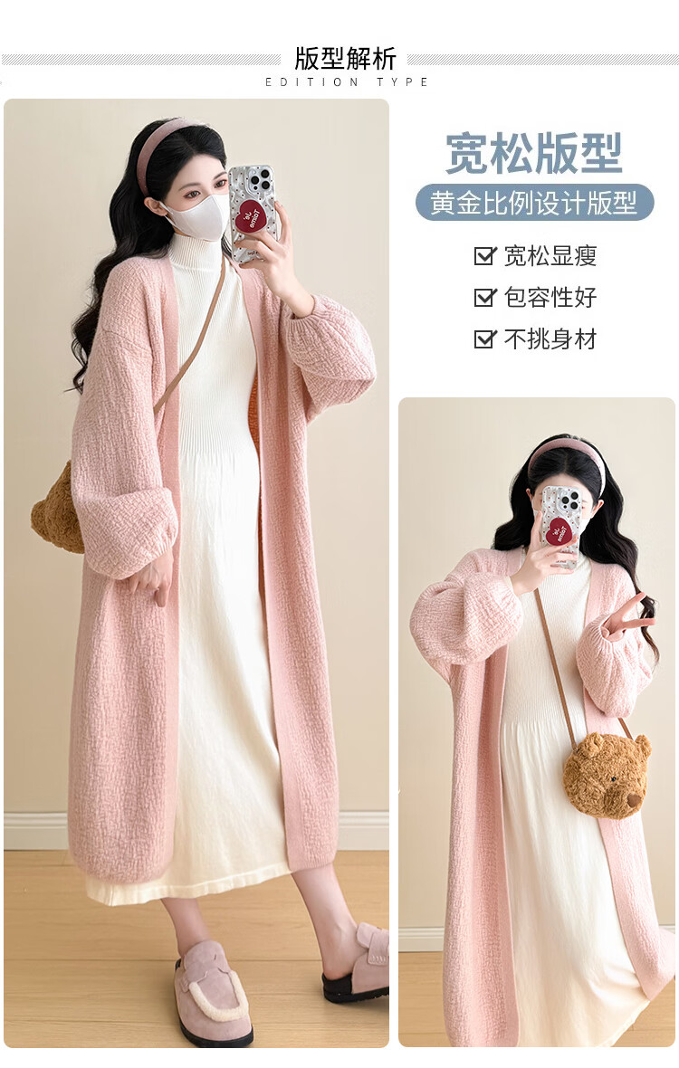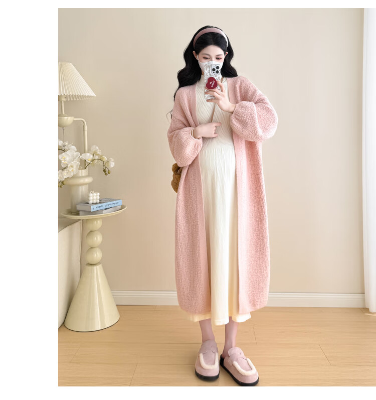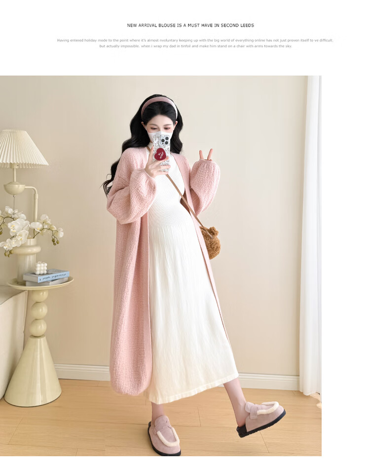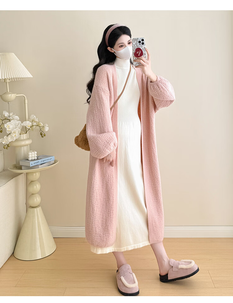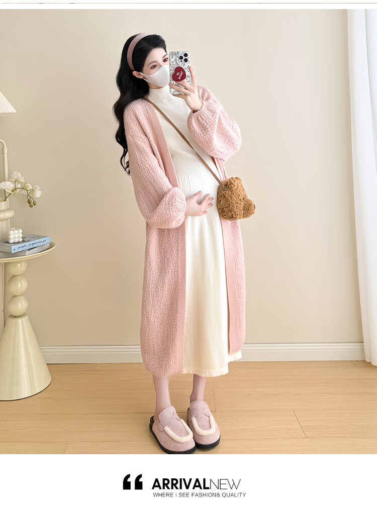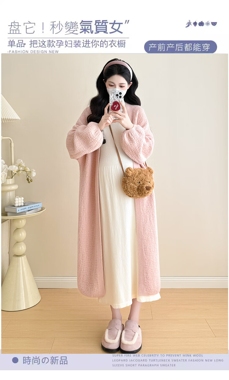 Nanding Yage Maternity Wear New Winter Bark Pattern Puff Sleeve Long Cardigan Jacket Knitted Dress Loose Lazy Suit Pink Jacket + Apricot Dress L