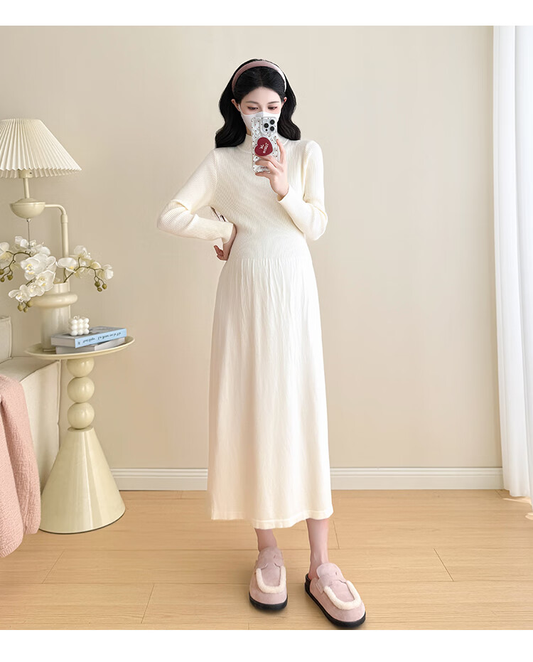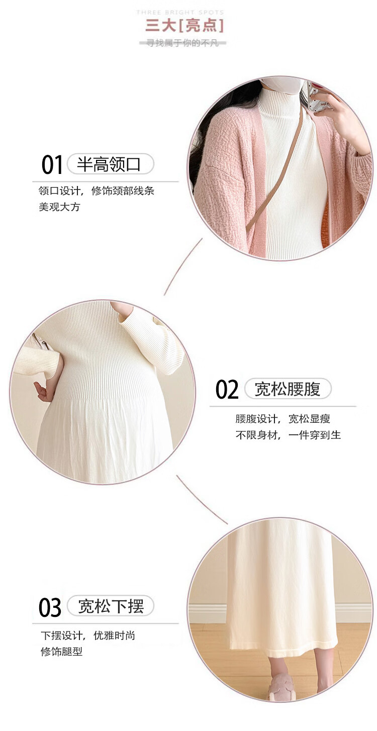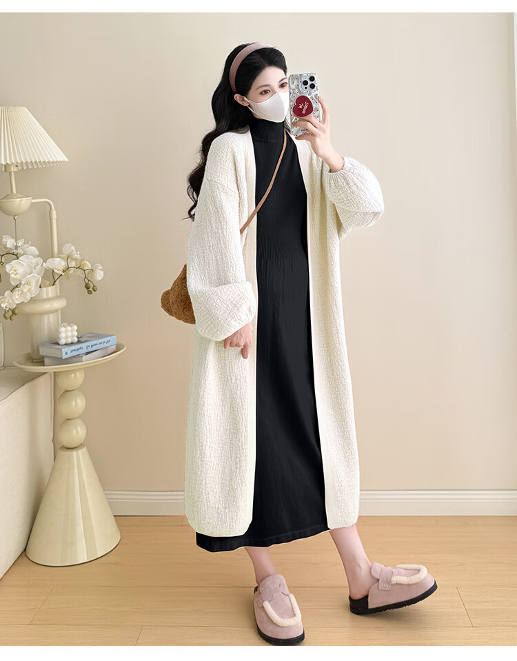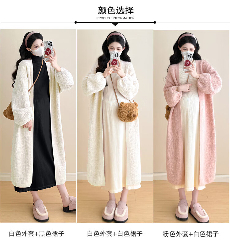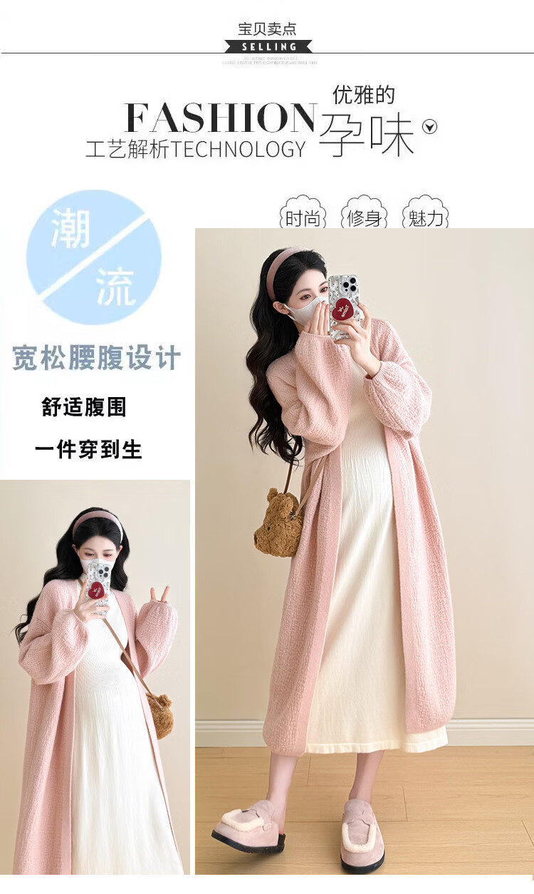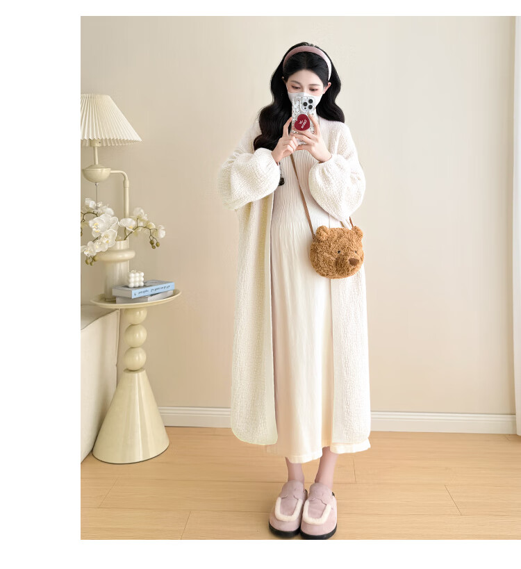 Nanding Yage Maternity Wear New Winter Bark Pattern Puff Sleeve Long Cardigan Jacket Knitted Dress Loose Lazy Suit Pink Jacket + Apricot Dress L
