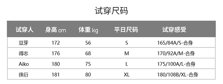 China (cm) 165 / 88-90 170 / 96-98 175 / 108-110 180 / 118-122 185 / 126-130