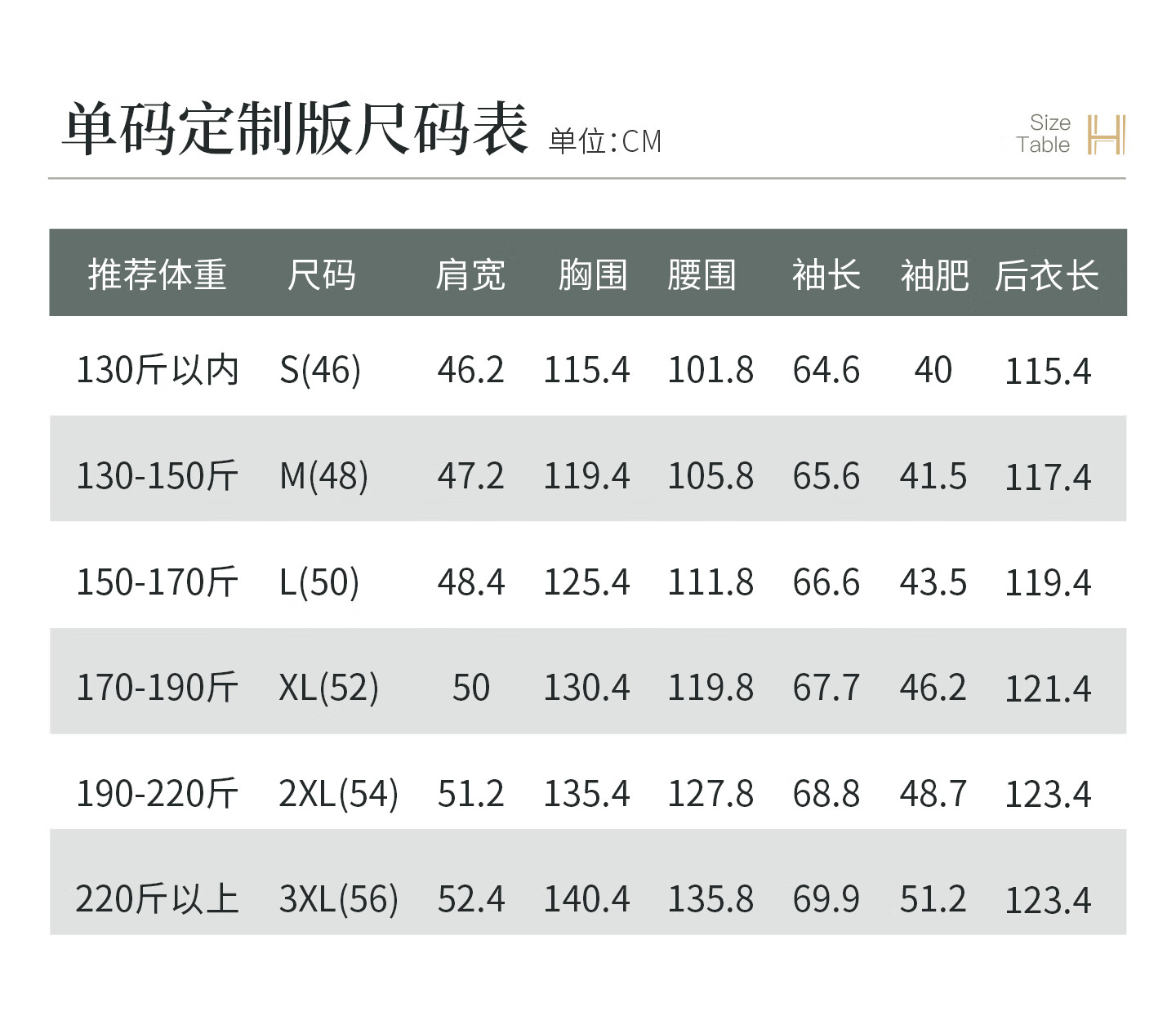 China (cm) 165 / 88-90 170 / 96-98 175 / 108-110 180 / 118-122 185 / 126-130