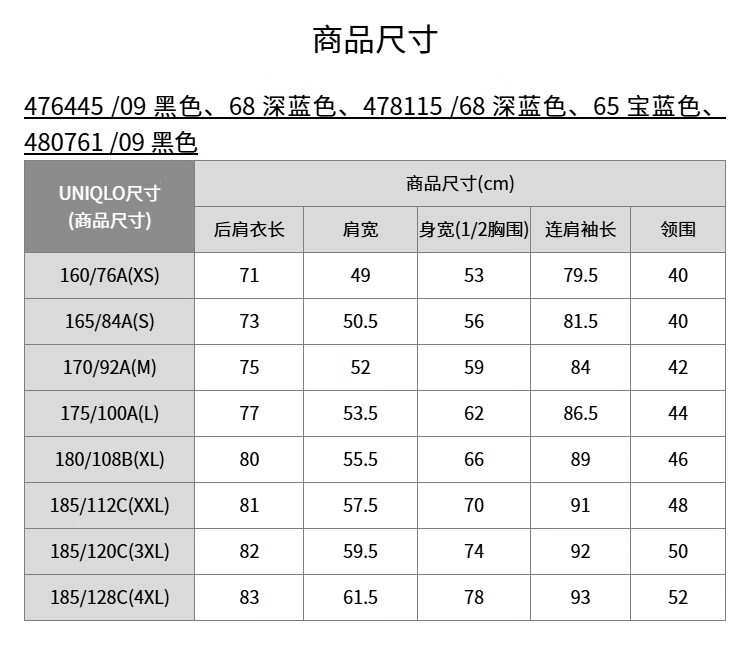 China (cm) 160-165/84-86 165-170 / 88-90 167-172 / 92-96 168-173 / 98-102 170-176 / 106-110