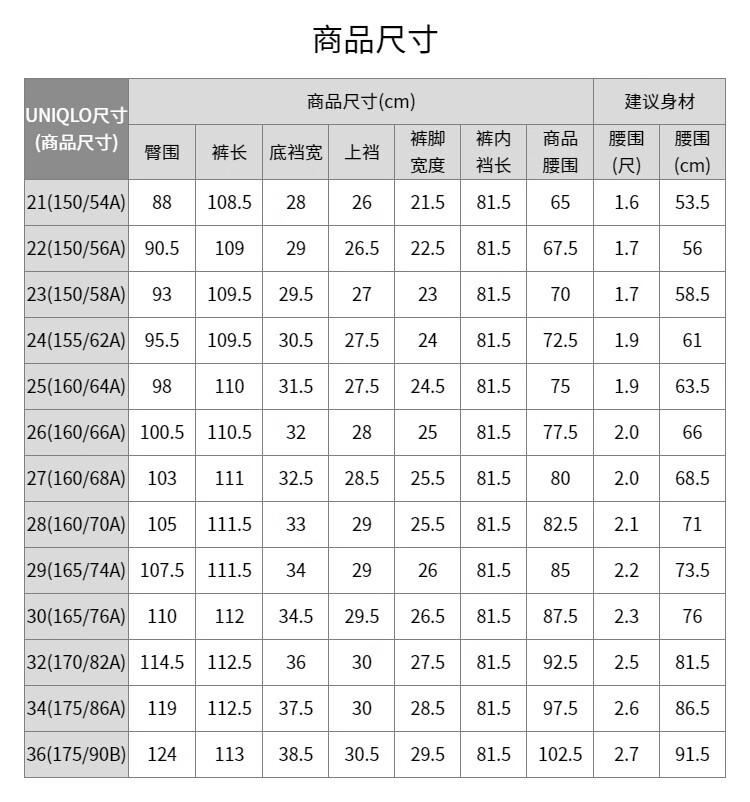 China (cm) 160-165/84-86 165-170 / 88-90 167-172 / 92-96 168-173 / 98-102 170-176 / 106-110