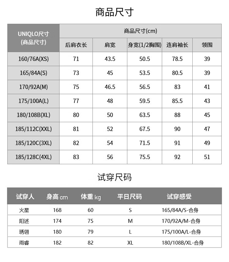 China (cm) 160-165/84-86 165-170 / 88-90 167-172 / 92-96 168-173 / 98-102 170-176 / 106-110