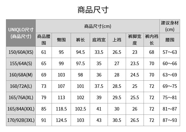 China (cm) 160-165/84-86 165-170 / 88-90 167-172 / 92-96 168-173 / 98-102 170-176 / 106-110