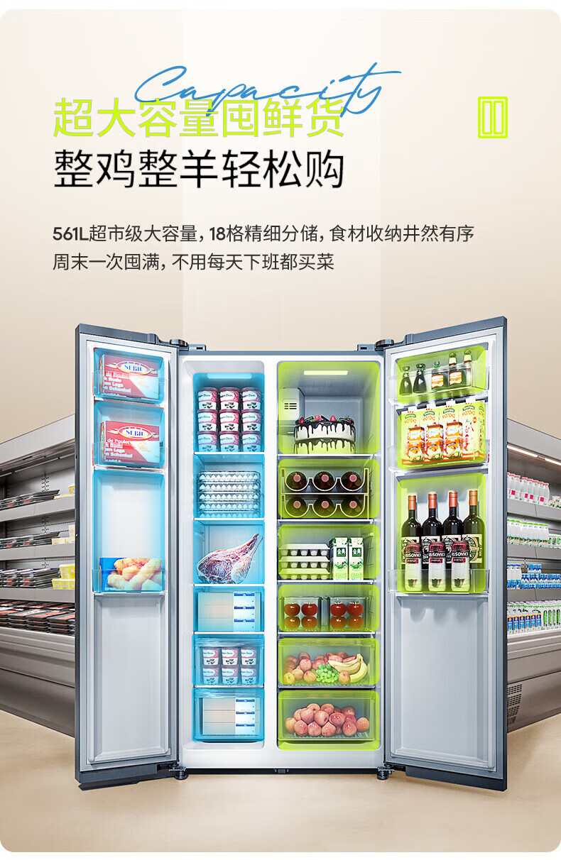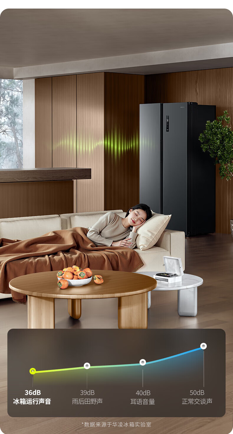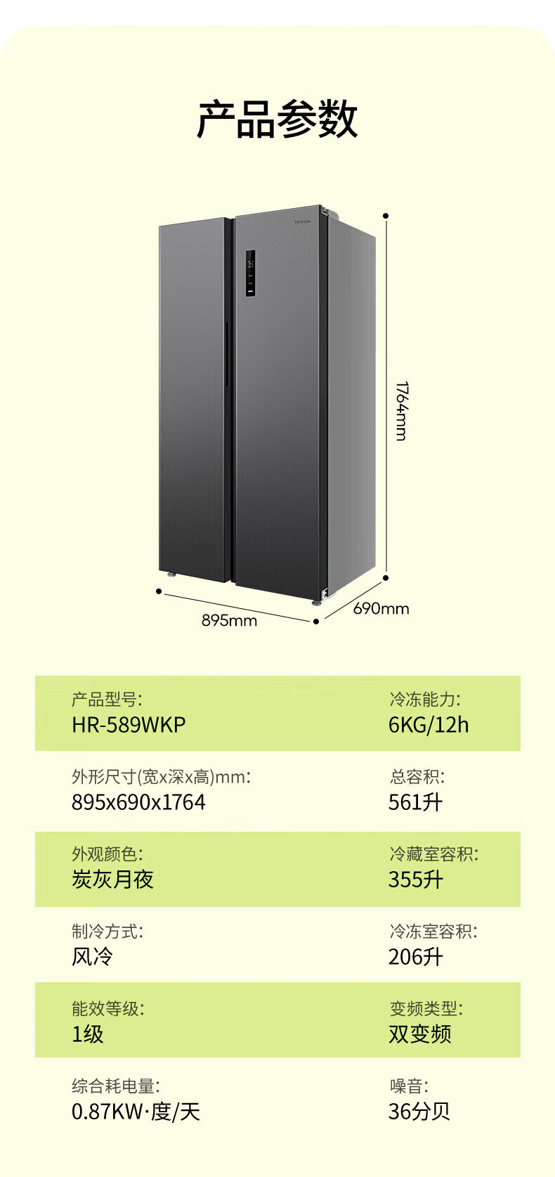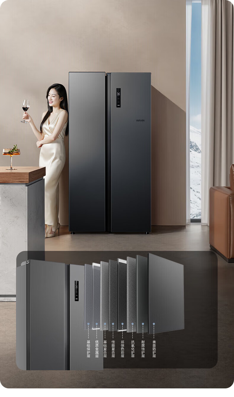 Hualing Refrigerator 589 double-door double-door large-capacity first-class energy-efficiency double frequency conversion circulation system PT clean smell ultra-thin air-cooled frost-free energy-saving household refrigerator HR-589WKP produced by Midea