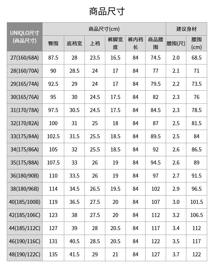 China (cm) 160-165/84-86 165-170 / 88-90 167-172 / 92-96 168-173 / 98-102 170-176 / 106-110