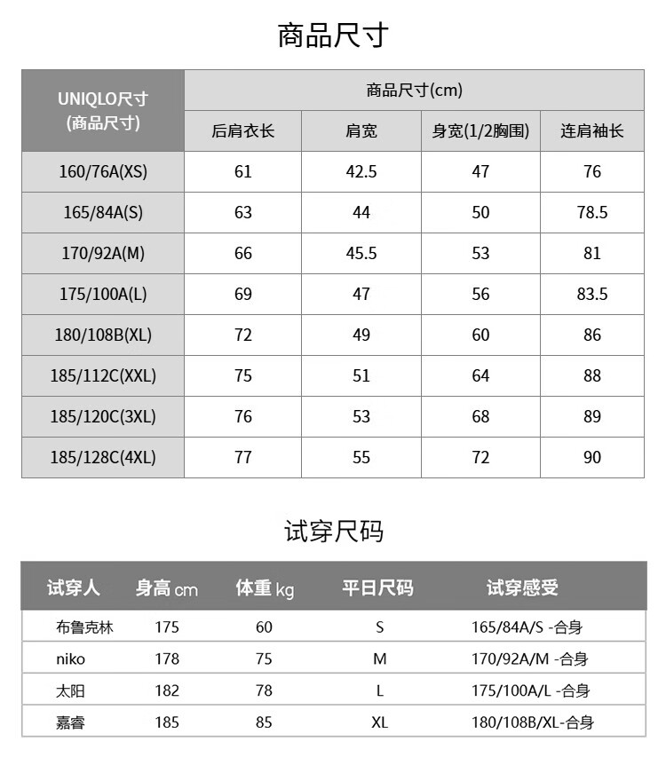 China (cm) 165 / 88-90 170 / 96-98 175 / 108-110 180 / 118-122 185 / 126-130