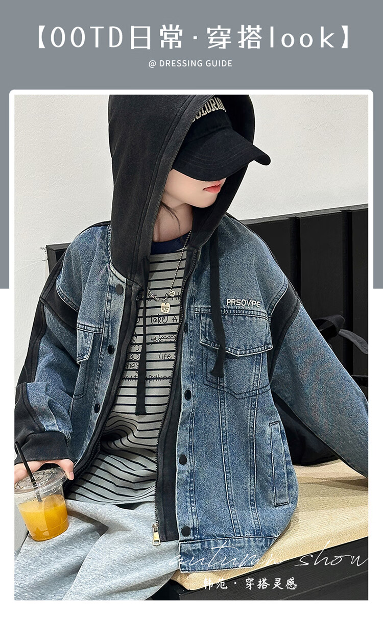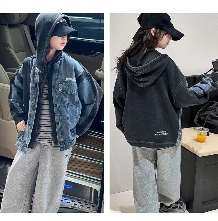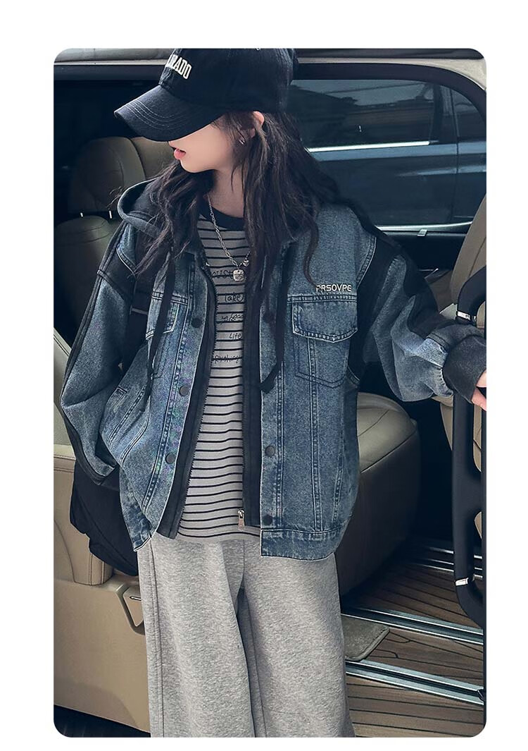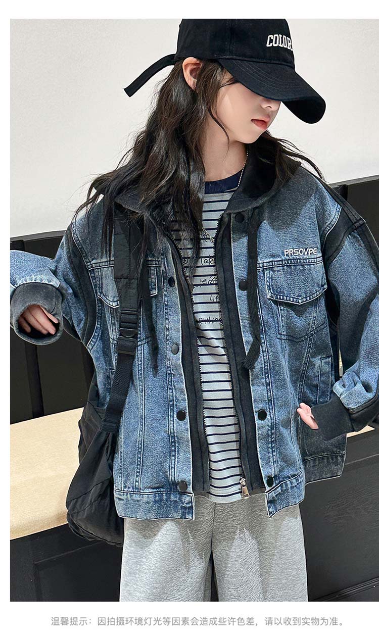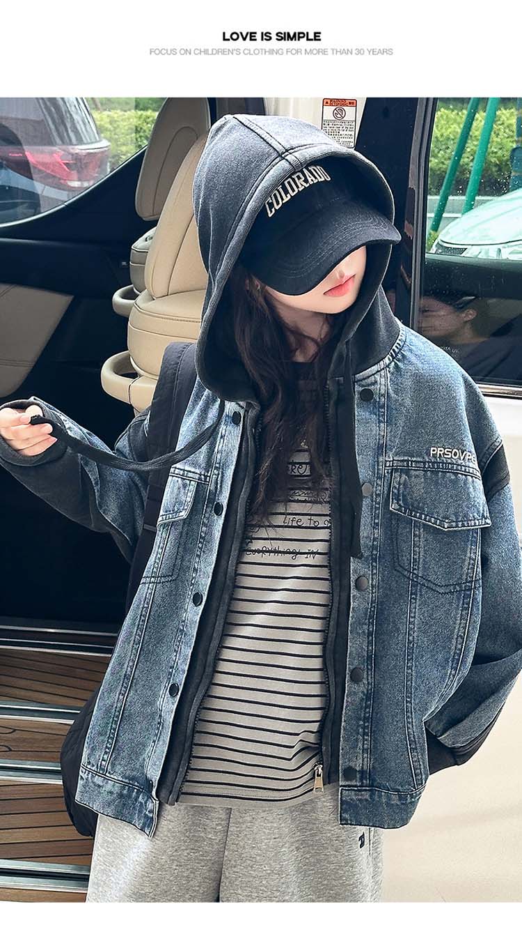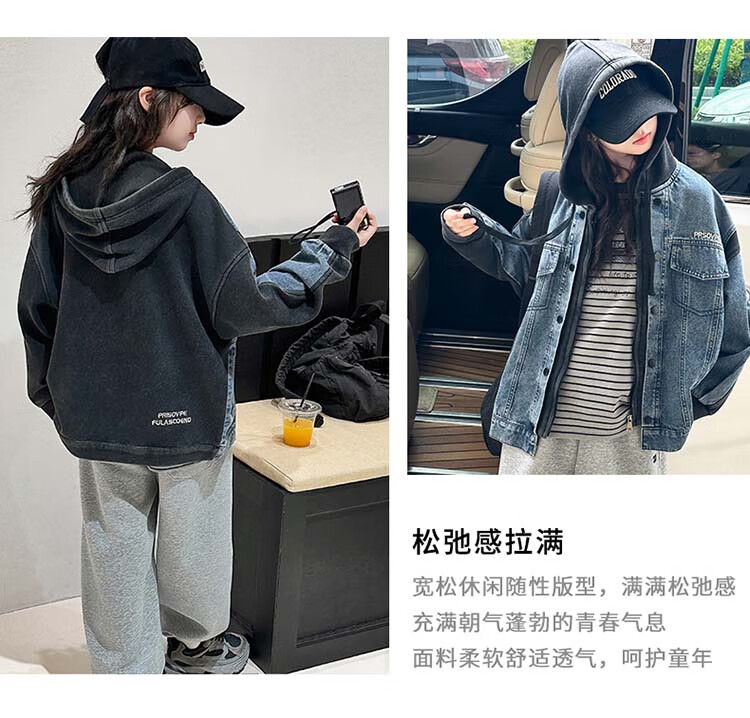 Burwilde international brand girls' denim jacket Korean style spring and autumn 2025 new style for middle-aged and older girls with style and personality hooded blue (jacket) 120 cm