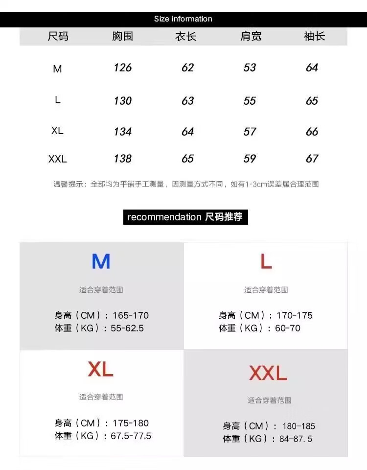 China (cm) 165 / 88-90 170 / 96-98 175 / 108-110 180 / 118-122 185 / 126-130