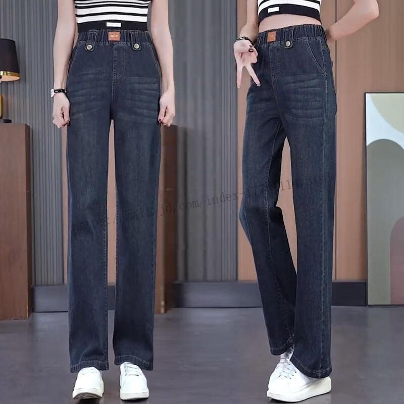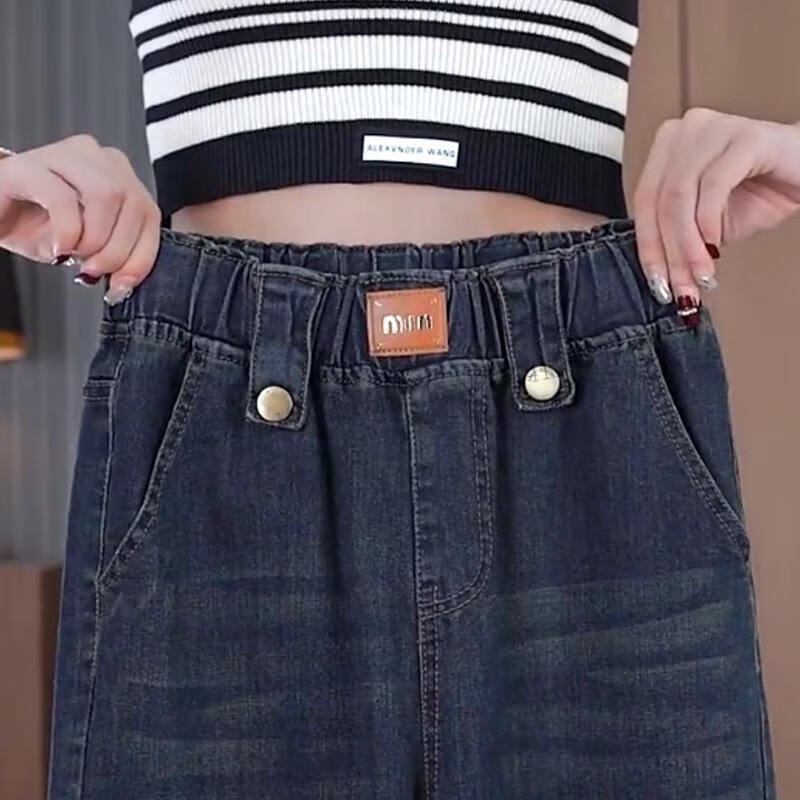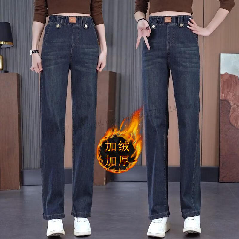 Hengyuanxiang elastic waist plus velvet thickened straight jeans for women 2025 autumn and winter new high waist elastic loose slimming women's pants 9661# retro blue high quality plus velvet L 107-117Jin Jin is equal to 0.5 kg