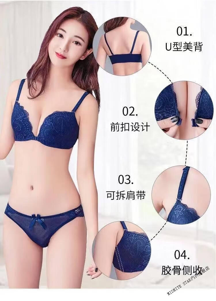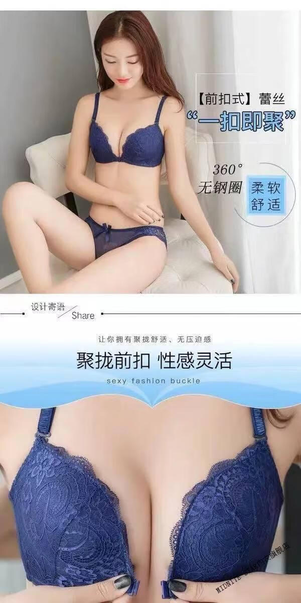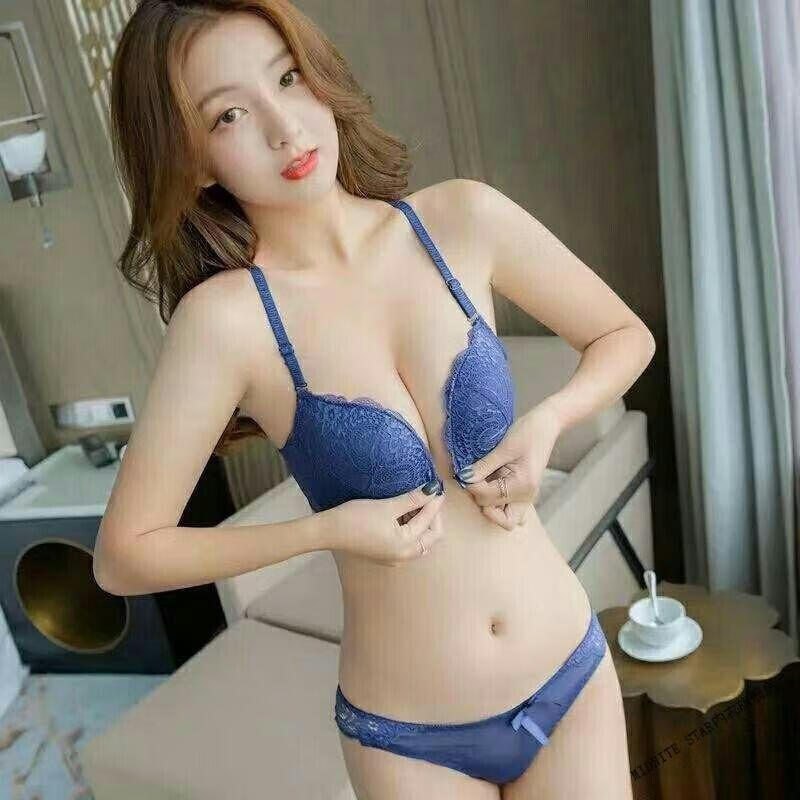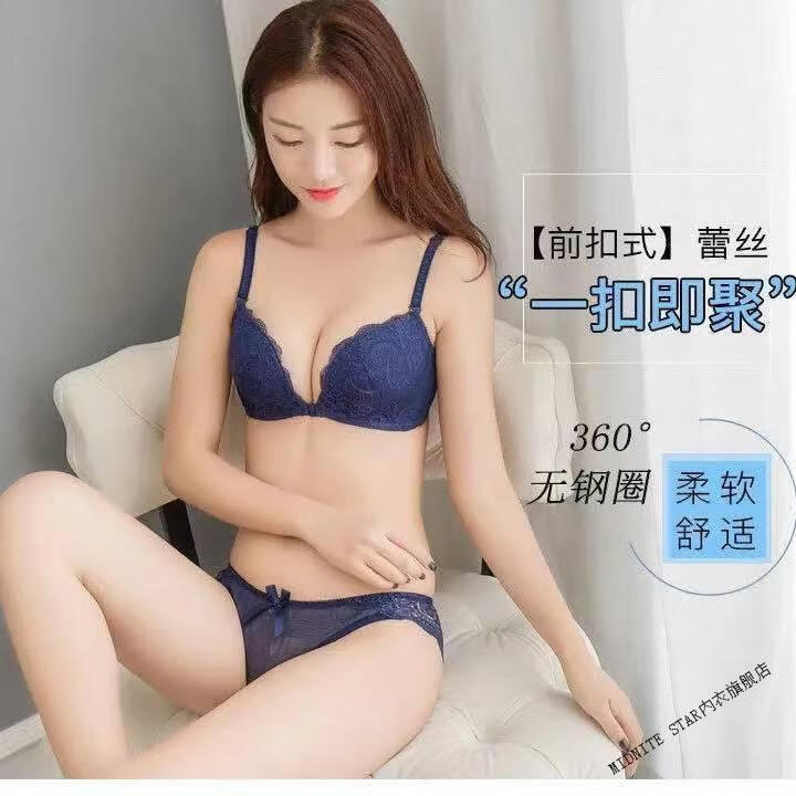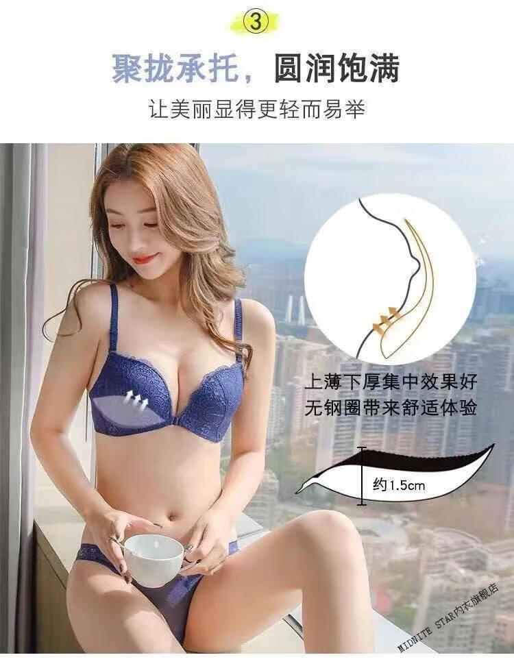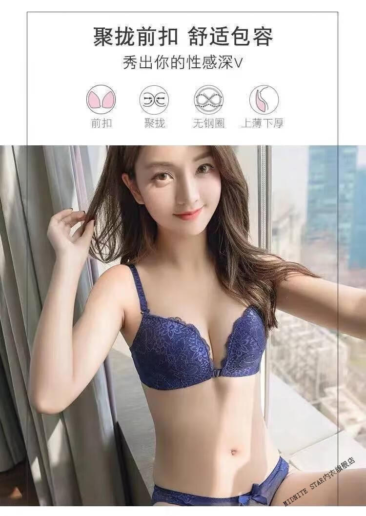 MIDNITE STAR Nuevo sujetador con botones delanteros Conjunto de ropa interior de encaje sexy sin hilos con recolección de senos pequeños y delgados Conjunto de ropa interior de encaje sexy inalámbrico Sujetador para mujer Azul zafiro + Caja de regalo con sujetador individual 70A 32B Parte superior delgada e inferior gruesa