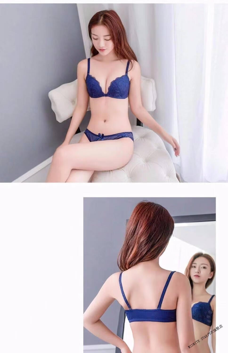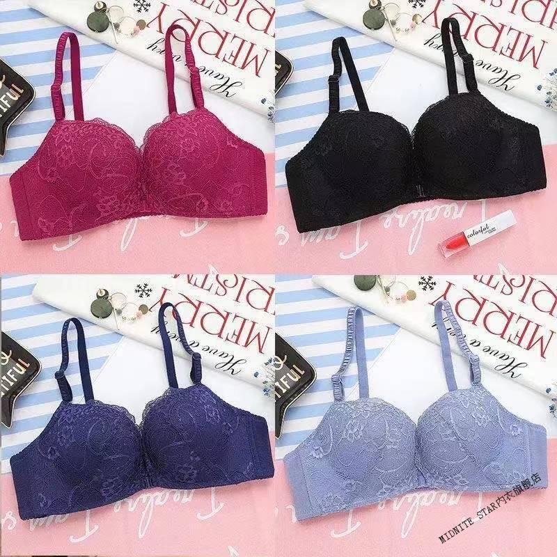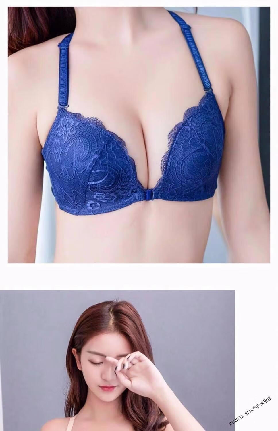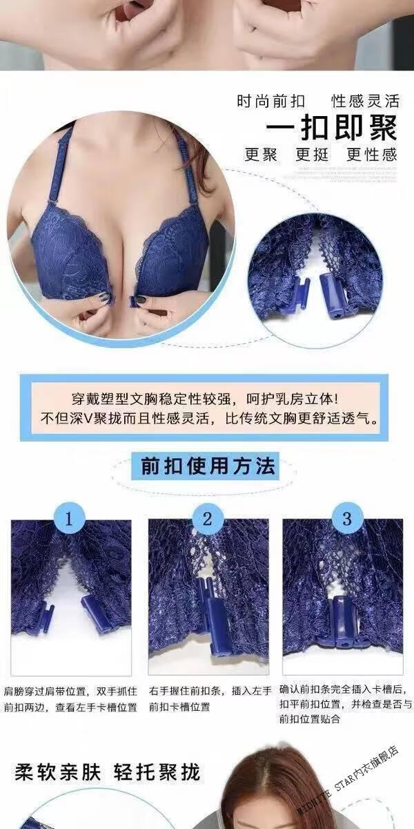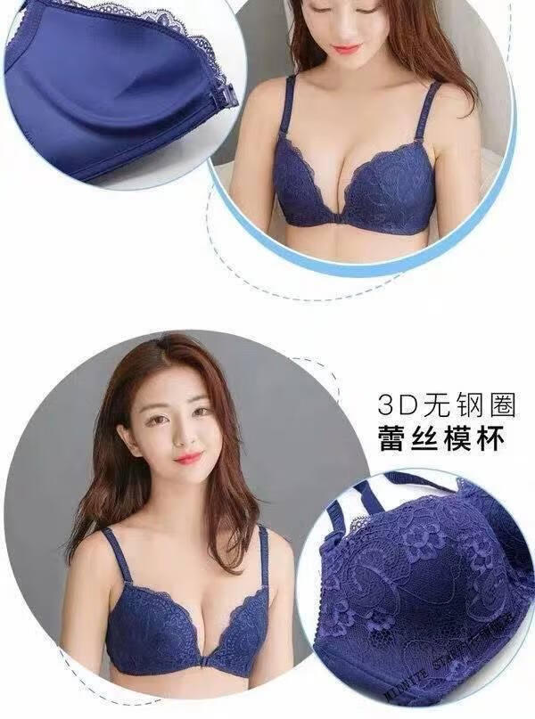 MIDNITE STAR Nuevo sujetador con botones delanteros Conjunto de ropa interior de encaje sexy sin hilos con recolección de senos pequeños y delgados Conjunto de ropa interior de encaje sexy inalámbrico Sujetador para mujer Azul zafiro + Caja de regalo con sujetador individual 70A 32B Parte superior delgada e inferior gruesa