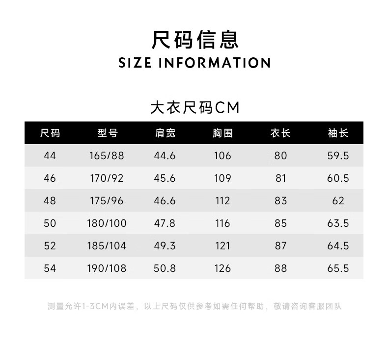 China (cm) 165 / 88-90 170 / 96-98 175 / 108-110 180 / 118-122 185 / 126-130